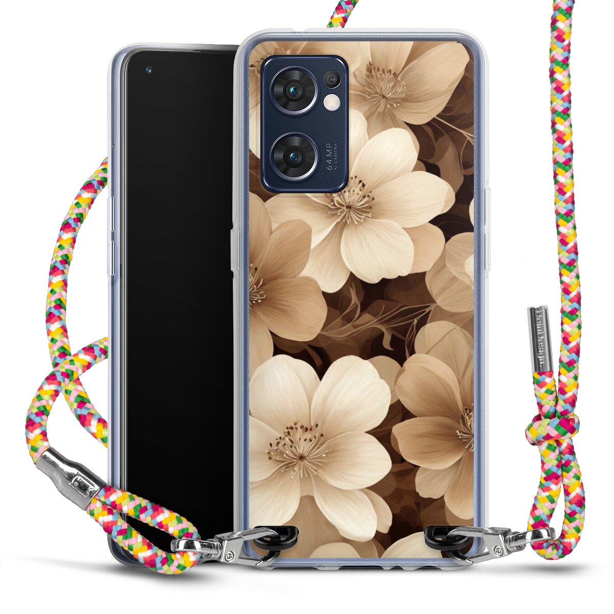 The flexible case is made from a highquality TPU material (thermoplastic Polyurethan). Thanks to its longlasting and break resistant characterisitcs, the case is flexible yet consistent in form and has a great grip and feel. The textile strap made from Polyester gives a chic yet casual accent allowing you to carry your phone like a bag or necklace - a practical gadget perfect for your next adventure. The textile strap is about 1.70 meters long and the length can easily be adjusted through the knots. Our Carry Case is available in Colourful, Mint-Camouflage, Very-Berry, Sahara-Sand and Sparkling-Neon. The ends of the textile strap are covered with metallic end caps to protect them against fraying.