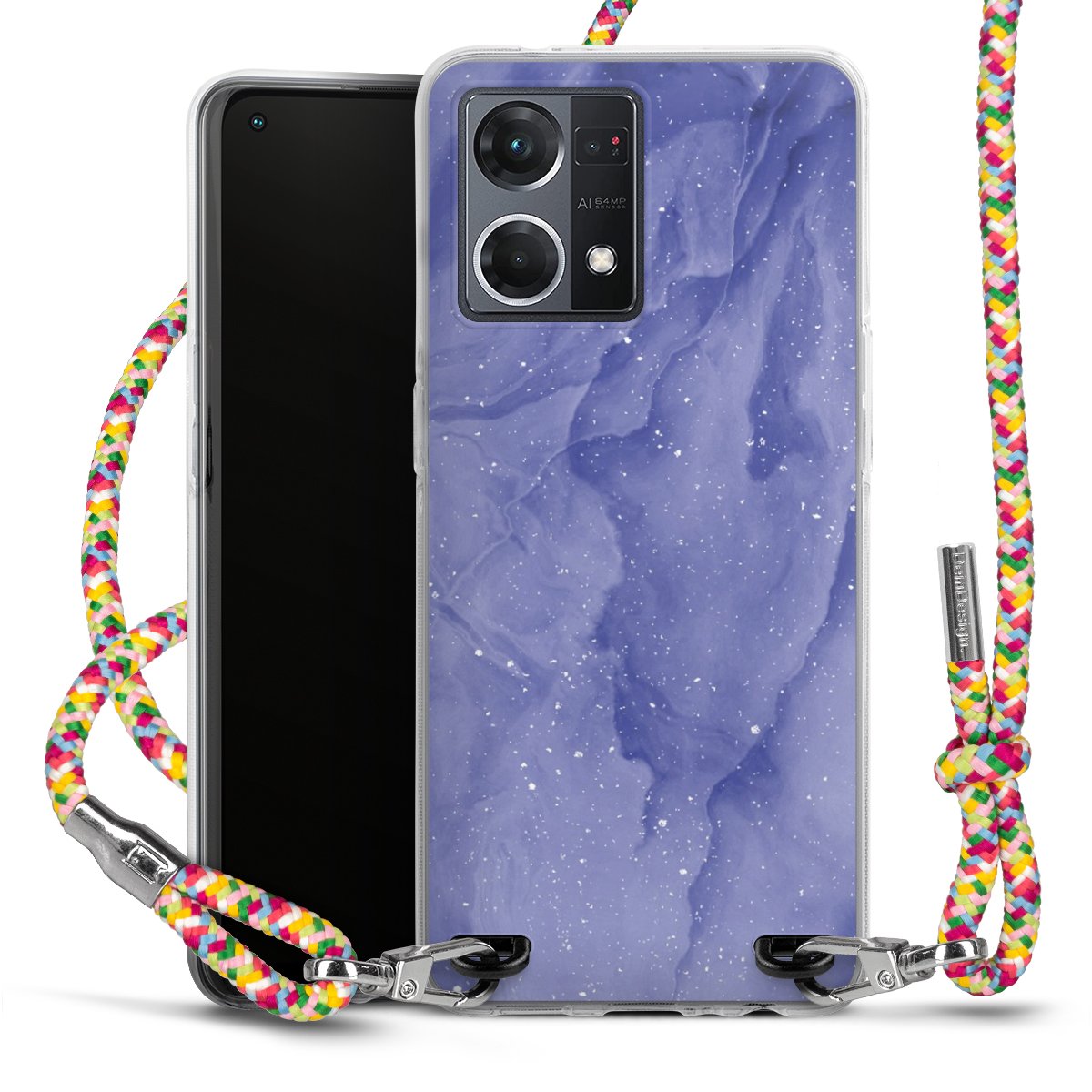 The flexible case is made from a highquality TPU material (thermoplastic Polyurethan). Thanks to its longlasting and break resistant characterisitcs, the case is flexible yet consistent in form and has a great grip and feel. The textile strap made from Polyester gives a chic yet casual accent allowing you to carry your phone like a bag or necklace - a practical gadget perfect for your next adventure. The textile strap is about 1.70 meters long and the length can easily be adjusted through the knots. Our Carry Case is available in Colourful, Mint-Camouflage, Very-Berry, Sahara-Sand and Sparkling-Neon. The ends of the textile strap are covered with metallic end caps to protect them against fraying.