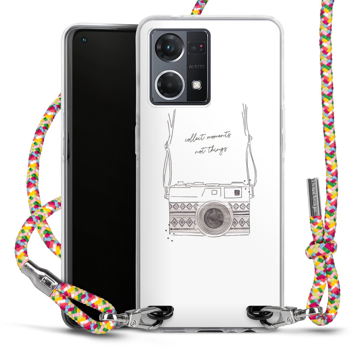 The flexible case is made from a highquality TPU material (thermoplastic Polyurethan). Thanks to its longlasting and break resistant characterisitcs, the case is flexible yet consistent in form and has a great grip and feel. The textile strap made from Polyester gives a chic yet casual accent allowing you to carry your phone like a bag or necklace - a practical gadget perfect for your next adventure. The textile strap is about 1.70 meters long and the length can easily be adjusted through the knots. Our Carry Case is available in Colourful, Mint-Camouflage, Very-Berry, Sahara-Sand and Sparkling-Neon. The ends of the textile strap are covered with metallic end caps to protect them against fraying.