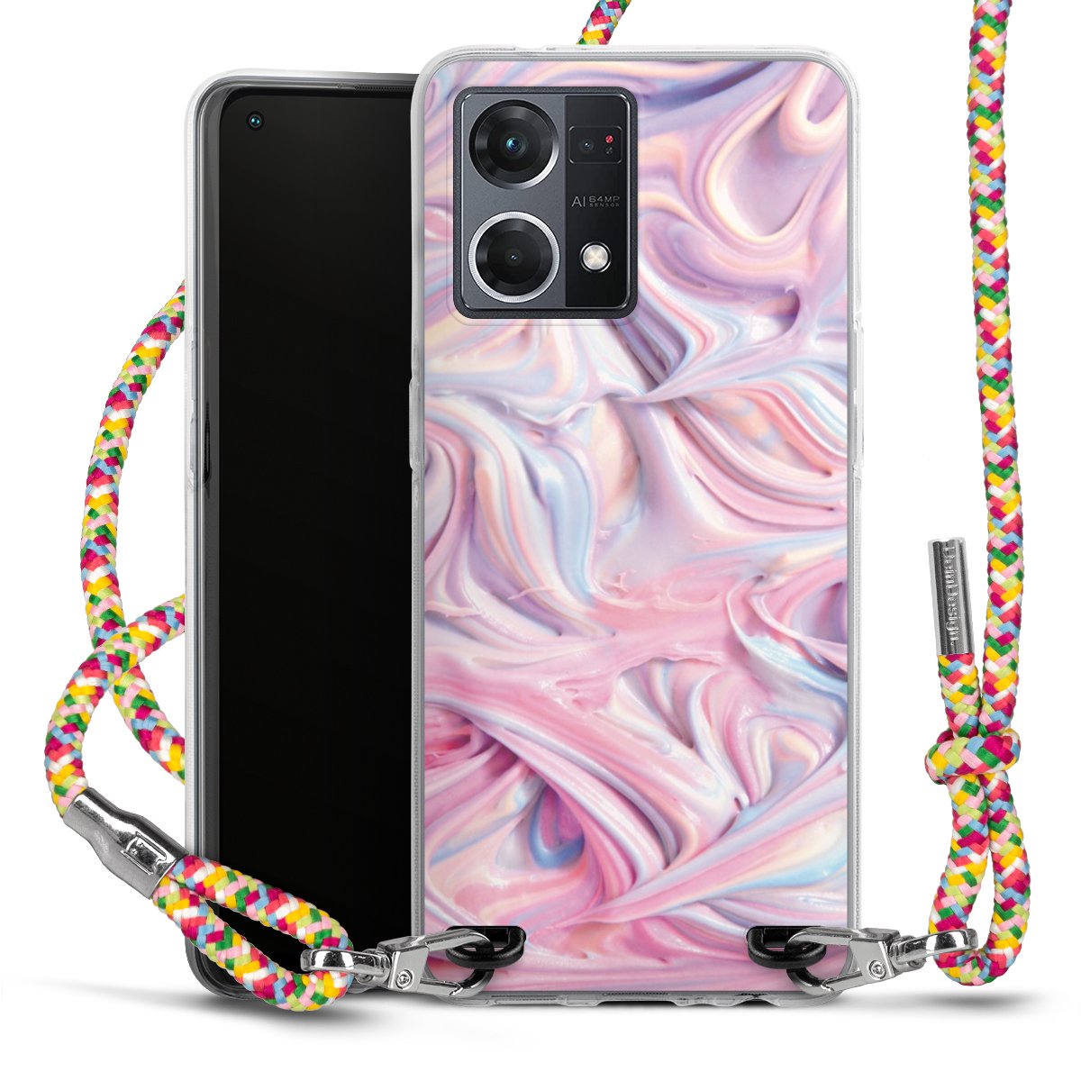The flexible case is made from a highquality TPU material (thermoplastic Polyurethan). Thanks to its longlasting and break resistant characterisitcs, the case is flexible yet consistent in form and has a great grip and feel. The textile strap made from Polyester gives a chic yet casual accent allowing you to carry your phone like a bag or necklace - a practical gadget perfect for your next adventure. The textile strap is about 1.70 meters long and the length can easily be adjusted through the knots. Our Carry Case is available in Colourful, Mint-Camouflage, Very-Berry, Sahara-Sand and Sparkling-Neon. The ends of the textile strap are covered with metallic end caps to protect them against fraying.