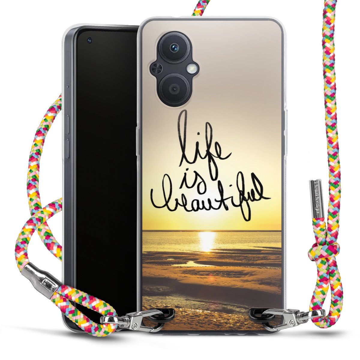 The flexible case is made from a highquality TPU material (thermoplastic Polyurethan). Thanks to its longlasting and break resistant characterisitcs, the case is flexible yet consistent in form and has a great grip and feel. The textile strap made from Polyester gives a chic yet casual accent allowing you to carry your phone like a bag or necklace - a practical gadget perfect for your next adventure. The textile strap is about 1.70 meters long and the length can easily be adjusted through the knots. Our Carry Case is available in Colourful, Mint-Camouflage, Very-Berry, Sahara-Sand and Sparkling-Neon. The ends of the textile strap are covered with metallic end caps to protect them against fraying.