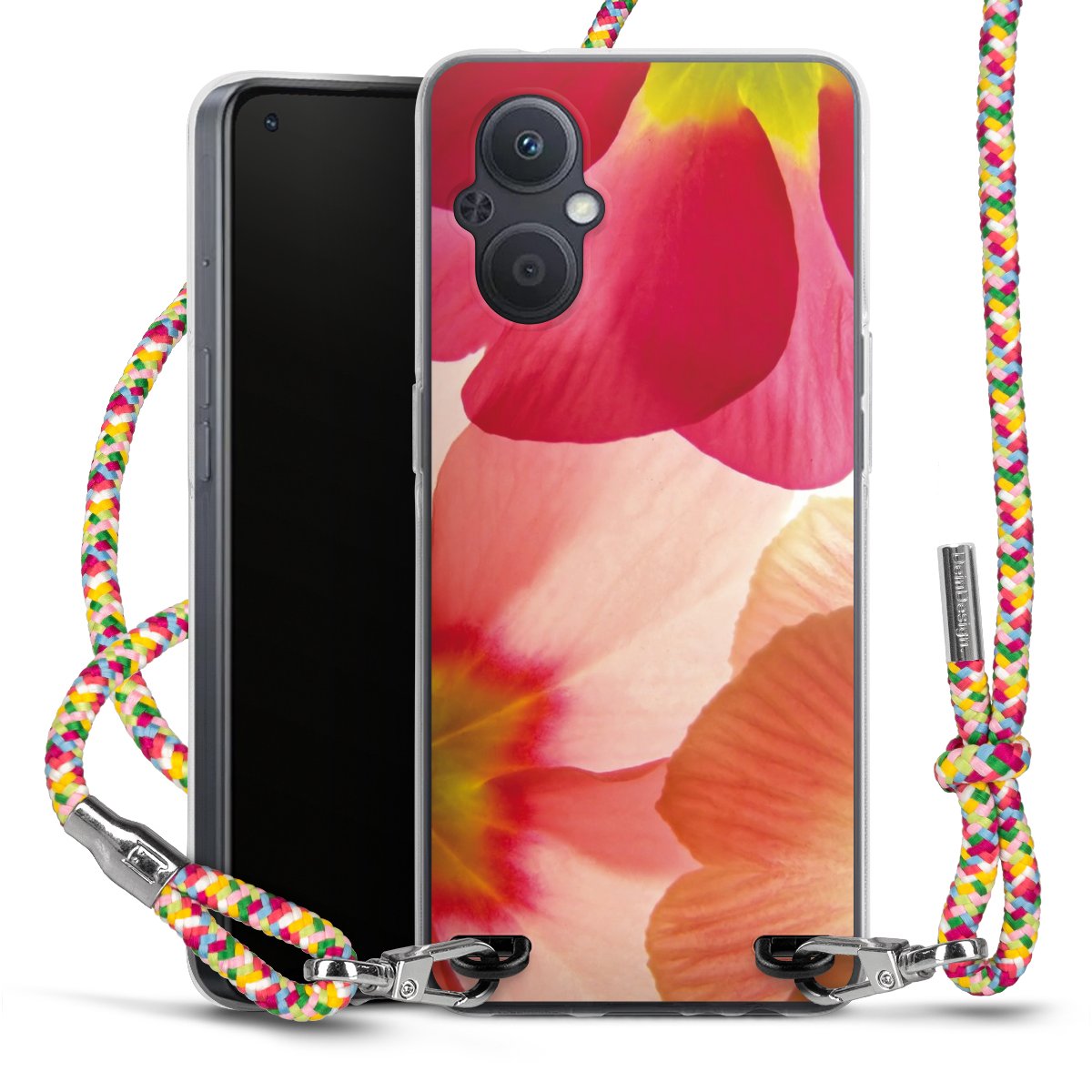 The flexible case is made from a highquality TPU material (thermoplastic Polyurethan). Thanks to its longlasting and break resistant characterisitcs, the case is flexible yet consistent in form and has a great grip and feel. The textile strap made from Polyester gives a chic yet casual accent allowing you to carry your phone like a bag or necklace - a practical gadget perfect for your next adventure. The textile strap is about 1.70 meters long and the length can easily be adjusted through the knots. Our Carry Case is available in Colourful, Mint-Camouflage, Very-Berry, Sahara-Sand and Sparkling-Neon. The ends of the textile strap are covered with metallic end caps to protect them against fraying.