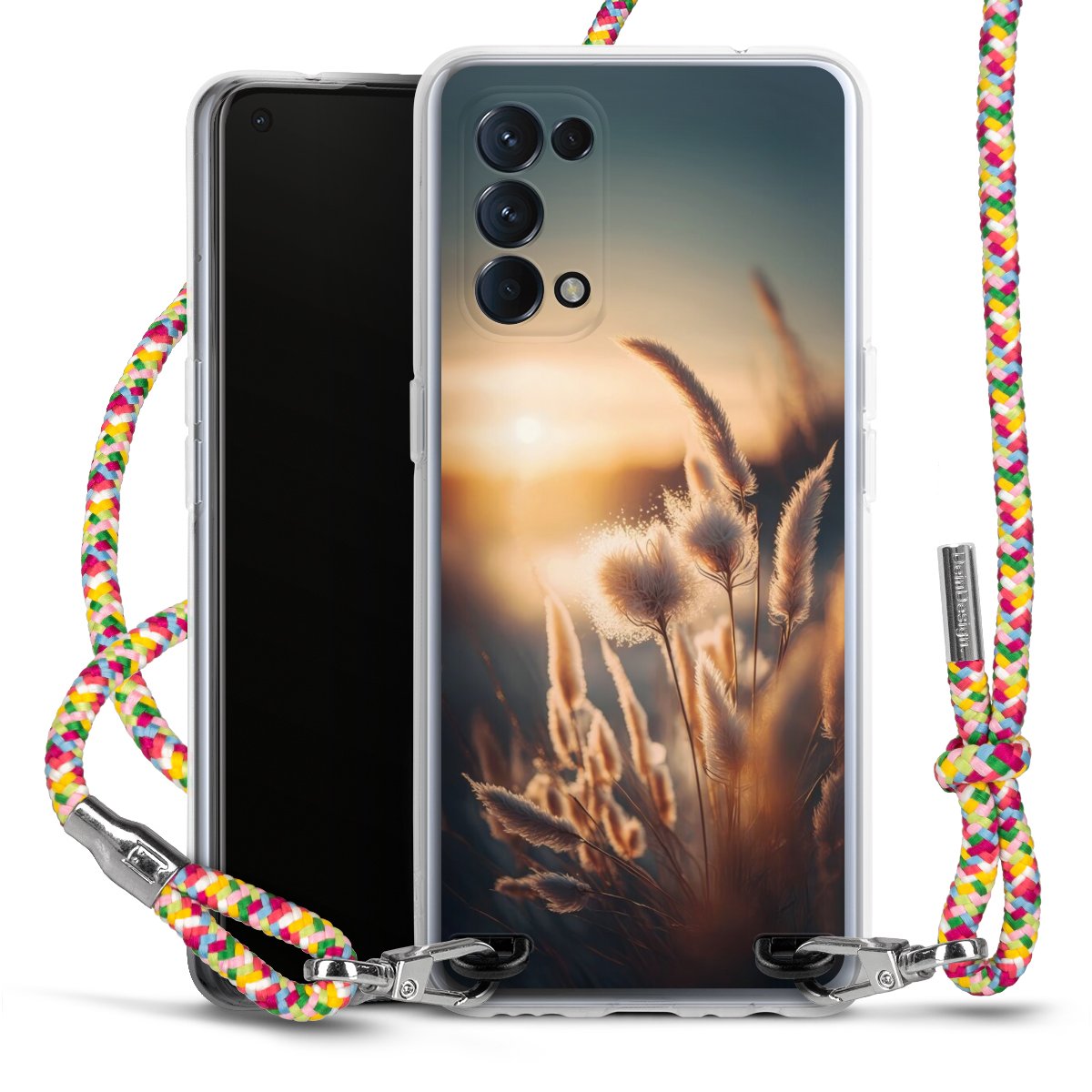 The flexible case is made from a highquality TPU material (thermoplastic Polyurethan). Thanks to its longlasting and break resistant characterisitcs, the case is flexible yet consistent in form and has a great grip and feel. The textile strap made from Polyester gives a chic yet casual accent allowing you to carry your phone like a bag or necklace - a practical gadget perfect for your next adventure. The textile strap is about 1.70 meters long and the length can easily be adjusted through the knots. Our Carry Case is available in Colourful, Mint-Camouflage, Very-Berry, Sahara-Sand and Sparkling-Neon. The ends of the textile strap are covered with metallic end caps to protect them against fraying.