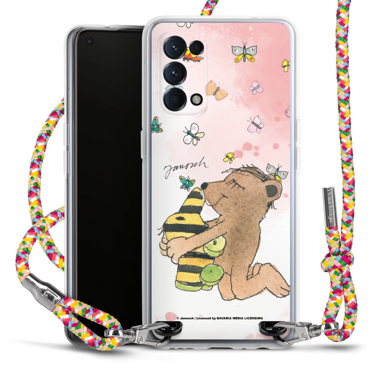 The flexible case is made from a highquality TPU material (thermoplastic Polyurethan). Thanks to its longlasting and break resistant characterisitcs, the case is flexible yet consistent in form and has a great grip and feel. The textile strap made from Polyester gives a chic yet casual accent allowing you to carry your phone like a bag or necklace - a practical gadget perfect for your next adventure. The textile strap is about 1.70 meters long and the length can easily be adjusted through the knots. Our Carry Case is available in Colourful, Mint-Camouflage, Very-Berry, Sahara-Sand and Sparkling-Neon. The ends of the textile strap are covered with metallic end caps to protect them against fraying.