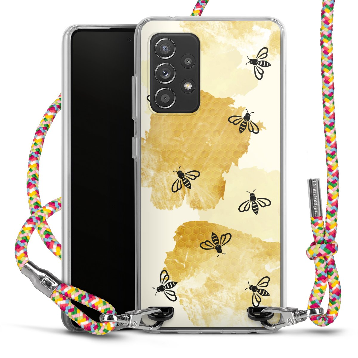 The flexible case is made from a highquality TPU material (thermoplastic Polyurethan). Thanks to its longlasting and break resistant characterisitcs, the case is flexible yet consistent in form and has a great grip and feel. The textile strap made from Polyester gives a chic yet casual accent allowing you to carry your phone like a bag or necklace - a practical gadget perfect for your next adventure. The textile strap is about 1.70 meters long and the length can easily be adjusted through the knots. Our Carry Case is available in Colourful, Mint-Camouflage, Very-Berry, Sahara-Sand and Sparkling-Neon. The ends of the textile strap are covered with metallic end caps to protect them against fraying.