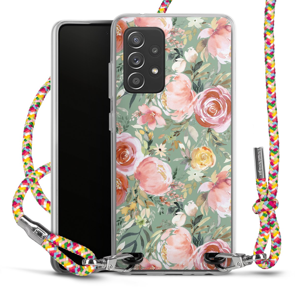 The flexible case is made from a highquality TPU material (thermoplastic Polyurethan). Thanks to its longlasting and break resistant characterisitcs, the case is flexible yet consistent in form and has a great grip and feel. The textile strap made from Polyester gives a chic yet casual accent allowing you to carry your phone like a bag or necklace - a practical gadget perfect for your next adventure. The textile strap is about 1.70 meters long and the length can easily be adjusted through the knots. Our Carry Case is available in Colourful, Mint-Camouflage, Very-Berry, Sahara-Sand and Sparkling-Neon. The ends of the textile strap are covered with metallic end caps to protect them against fraying.