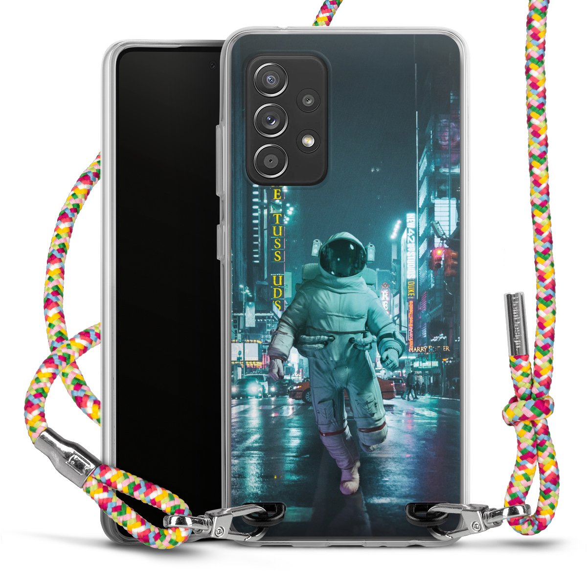 The flexible case is made from a highquality TPU material (thermoplastic Polyurethan). Thanks to its longlasting and break resistant characterisitcs, the case is flexible yet consistent in form and has a great grip and feel. The textile strap made from Polyester gives a chic yet casual accent allowing you to carry your phone like a bag or necklace - a practical gadget perfect for your next adventure. The textile strap is about 1.70 meters long and the length can easily be adjusted through the knots. Our Carry Case is available in Colourful, Mint-Camouflage, Very-Berry, Sahara-Sand and Sparkling-Neon. The ends of the textile strap are covered with metallic end caps to protect them against fraying.