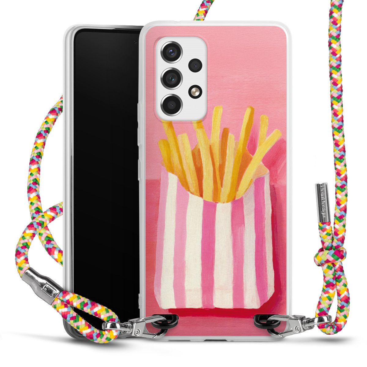 The flexible case is made from a highquality TPU material (thermoplastic Polyurethan). Thanks to its longlasting and break resistant characterisitcs, the case is flexible yet consistent in form and has a great grip and feel. The textile strap made from Polyester gives a chic yet casual accent allowing you to carry your phone like a bag or necklace - a practical gadget perfect for your next adventure. The textile strap is about 1.70 meters long and the length can easily be adjusted through the knots. Our Carry Case is available in Colourful, Mint-Camouflage, Very-Berry, Sahara-Sand and Sparkling-Neon. The ends of the textile strap are covered with metallic end caps to protect them against fraying.