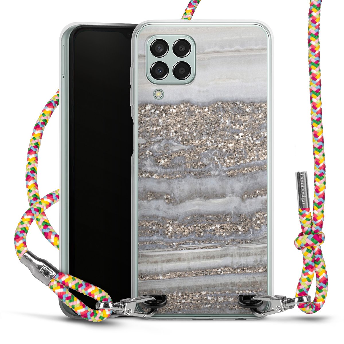 The flexible case is made from a highquality TPU material (thermoplastic Polyurethan). Thanks to its longlasting and break resistant characterisitcs, the case is flexible yet consistent in form and has a great grip and feel. The textile strap made from Polyester gives a chic yet casual accent allowing you to carry your phone like a bag or necklace - a practical gadget perfect for your next adventure. The textile strap is about 1.70 meters long and the length can easily be adjusted through the knots. Our Carry Case is available in Colourful, Mint-Camouflage, Very-Berry, Sahara-Sand and Sparkling-Neon. The ends of the textile strap are covered with metallic end caps to protect them against fraying.