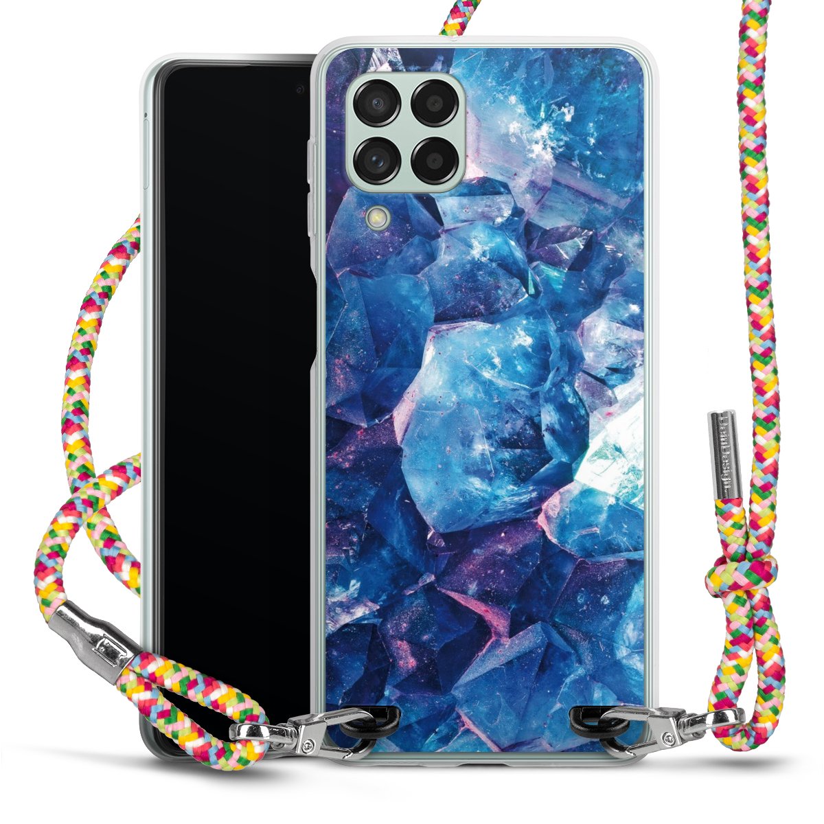 The flexible case is made from a highquality TPU material (thermoplastic Polyurethan). Thanks to its longlasting and break resistant characterisitcs, the case is flexible yet consistent in form and has a great grip and feel. The textile strap made from Polyester gives a chic yet casual accent allowing you to carry your phone like a bag or necklace - a practical gadget perfect for your next adventure. The textile strap is about 1.70 meters long and the length can easily be adjusted through the knots. Our Carry Case is available in Colourful, Mint-Camouflage, Very-Berry, Sahara-Sand and Sparkling-Neon. The ends of the textile strap are covered with metallic end caps to protect them against fraying.