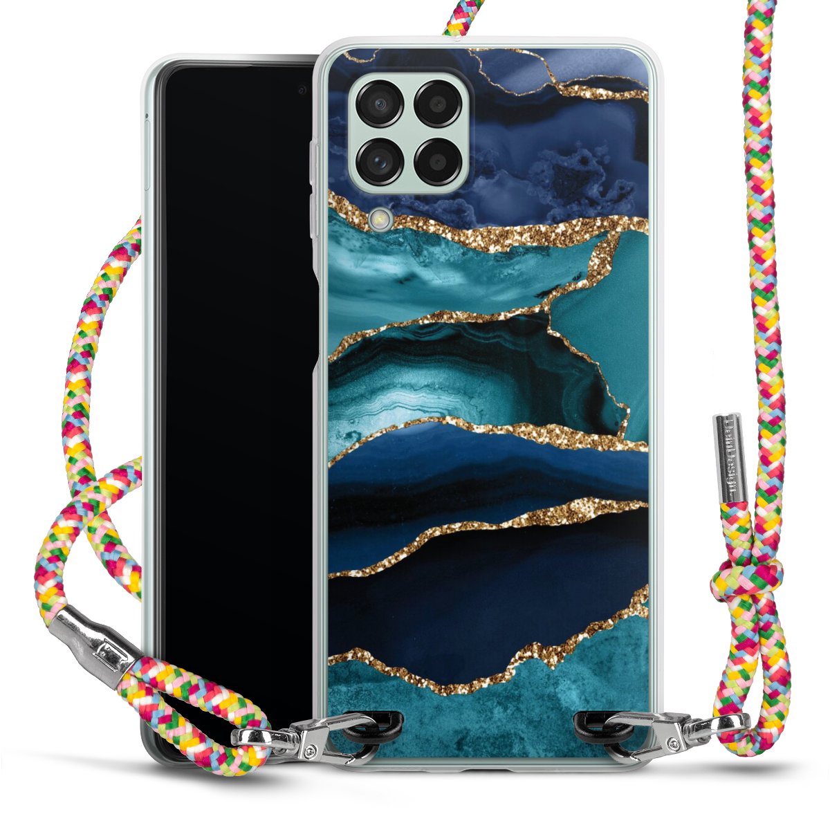 The flexible case is made from a highquality TPU material (thermoplastic Polyurethan). Thanks to its longlasting and break resistant characterisitcs, the case is flexible yet consistent in form and has a great grip and feel. The textile strap made from Polyester gives a chic yet casual accent allowing you to carry your phone like a bag or necklace - a practical gadget perfect for your next adventure. The textile strap is about 1.70 meters long and the length can easily be adjusted through the knots. Our Carry Case is available in Colourful, Mint-Camouflage, Very-Berry, Sahara-Sand and Sparkling-Neon. The ends of the textile strap are covered with metallic end caps to protect them against fraying.