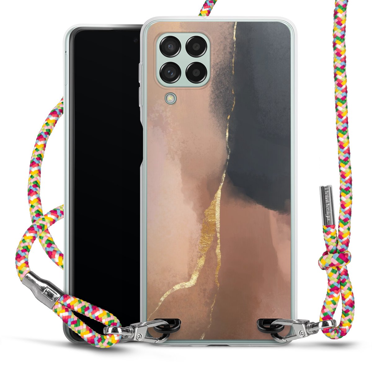 The flexible case is made from a highquality TPU material (thermoplastic Polyurethan). Thanks to its longlasting and break resistant characterisitcs, the case is flexible yet consistent in form and has a great grip and feel. The textile strap made from Polyester gives a chic yet casual accent allowing you to carry your phone like a bag or necklace - a practical gadget perfect for your next adventure. The textile strap is about 1.70 meters long and the length can easily be adjusted through the knots. Our Carry Case is available in Colourful, Mint-Camouflage, Very-Berry, Sahara-Sand and Sparkling-Neon. The ends of the textile strap are covered with metallic end caps to protect them against fraying.