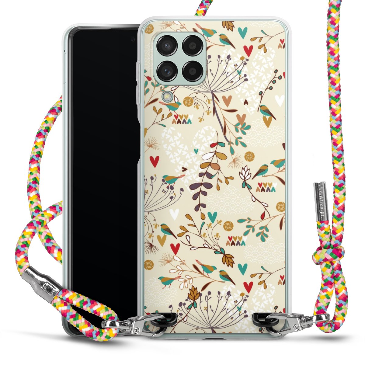 The flexible case is made from a highquality TPU material (thermoplastic Polyurethan). Thanks to its longlasting and break resistant characterisitcs, the case is flexible yet consistent in form and has a great grip and feel. The textile strap made from Polyester gives a chic yet casual accent allowing you to carry your phone like a bag or necklace - a practical gadget perfect for your next adventure. The textile strap is about 1.70 meters long and the length can easily be adjusted through the knots. Our Carry Case is available in Colourful, Mint-Camouflage, Very-Berry, Sahara-Sand and Sparkling-Neon. The ends of the textile strap are covered with metallic end caps to protect them against fraying.