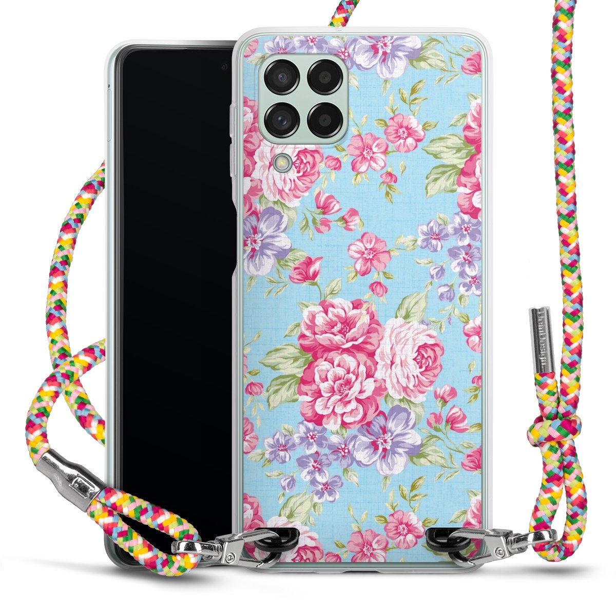 The flexible case is made from a highquality TPU material (thermoplastic Polyurethan). Thanks to its longlasting and break resistant characterisitcs, the case is flexible yet consistent in form and has a great grip and feel. The textile strap made from Polyester gives a chic yet casual accent allowing you to carry your phone like a bag or necklace - a practical gadget perfect for your next adventure. The textile strap is about 1.70 meters long and the length can easily be adjusted through the knots. Our Carry Case is available in Colourful, Mint-Camouflage, Very-Berry, Sahara-Sand and Sparkling-Neon. The ends of the textile strap are covered with metallic end caps to protect them against fraying.