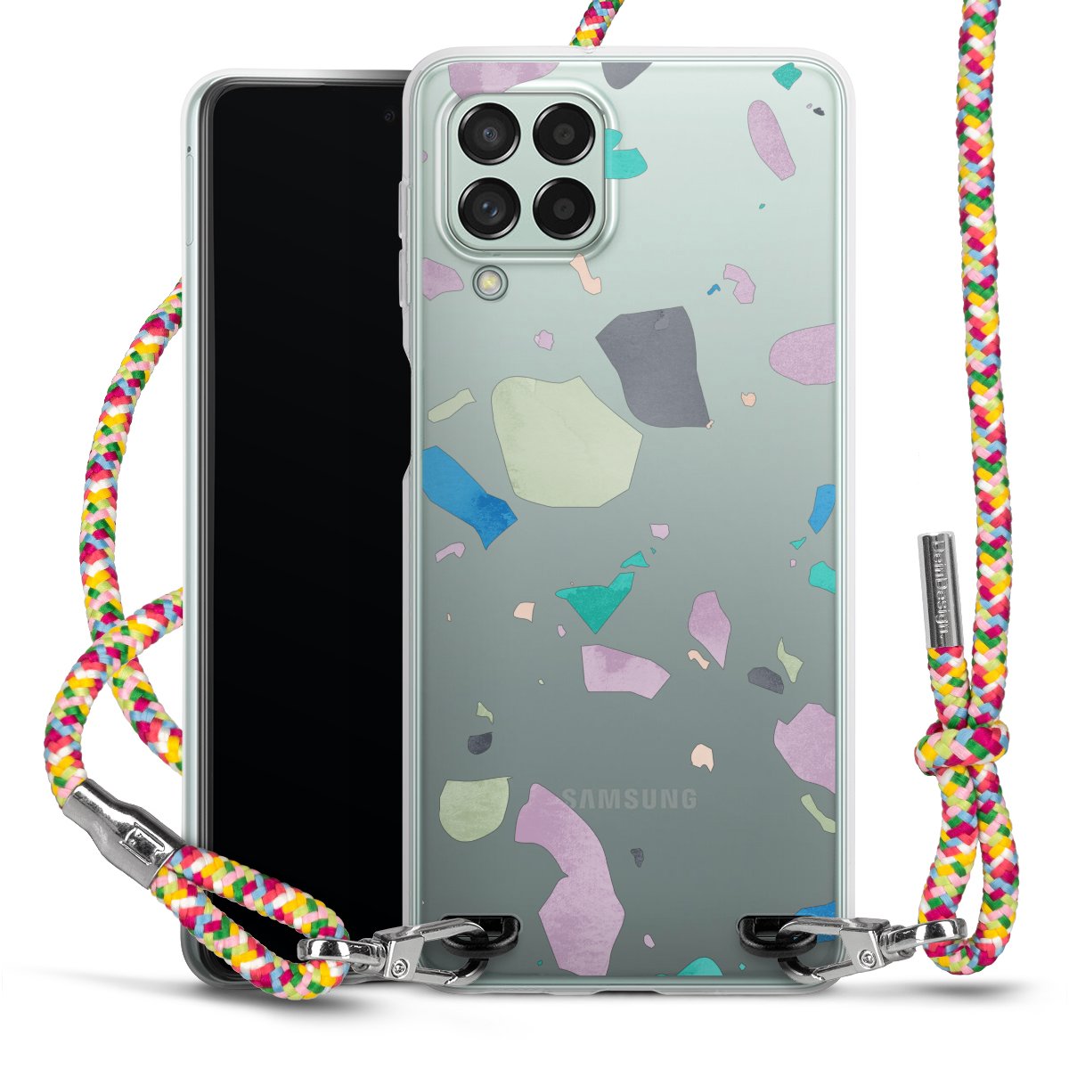 The flexible case is made from a highquality TPU material (thermoplastic Polyurethan). Thanks to its longlasting and break resistant characterisitcs, the case is flexible yet consistent in form and has a great grip and feel. The textile strap made from Polyester gives a chic yet casual accent allowing you to carry your phone like a bag or necklace - a practical gadget perfect for your next adventure. The textile strap is about 1.70 meters long and the length can easily be adjusted through the knots. Our Carry Case is available in Colourful, Mint-Camouflage, Very-Berry, Sahara-Sand and Sparkling-Neon. The ends of the textile strap are covered with metallic end caps to protect them against fraying.
