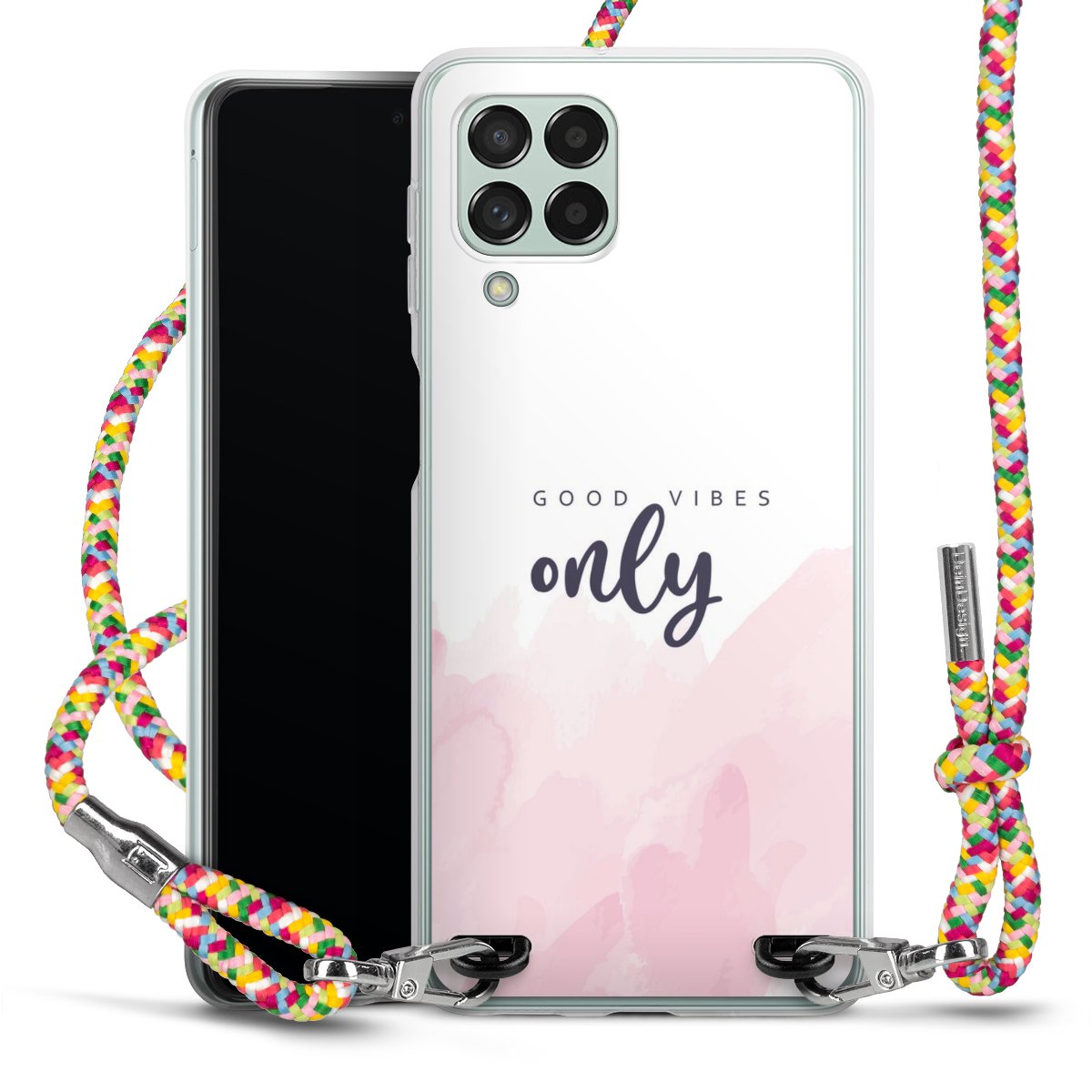The flexible case is made from a highquality TPU material (thermoplastic Polyurethan). Thanks to its longlasting and break resistant characterisitcs, the case is flexible yet consistent in form and has a great grip and feel. The textile strap made from Polyester gives a chic yet casual accent allowing you to carry your phone like a bag or necklace - a practical gadget perfect for your next adventure. The textile strap is about 1.70 meters long and the length can easily be adjusted through the knots. Our Carry Case is available in Colourful, Mint-Camouflage, Very-Berry, Sahara-Sand and Sparkling-Neon. The ends of the textile strap are covered with metallic end caps to protect them against fraying.