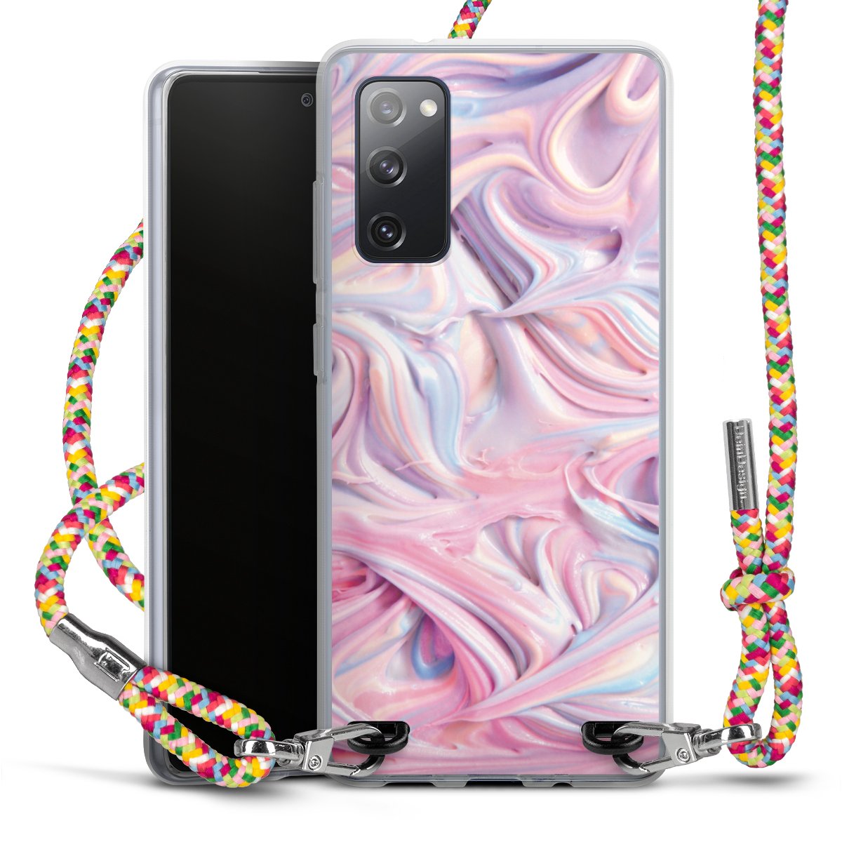 The flexible case is made from a highquality TPU material (thermoplastic Polyurethan). Thanks to its longlasting and break resistant characterisitcs, the case is flexible yet consistent in form and has a great grip and feel. The textile strap made from Polyester gives a chic yet casual accent allowing you to carry your phone like a bag or necklace - a practical gadget perfect for your next adventure. The textile strap is about 1.70 meters long and the length can easily be adjusted through the knots. Our Carry Case is available in Colourful, Mint-Camouflage, Very-Berry, Sahara-Sand and Sparkling-Neon. The ends of the textile strap are covered with metallic end caps to protect them against fraying.