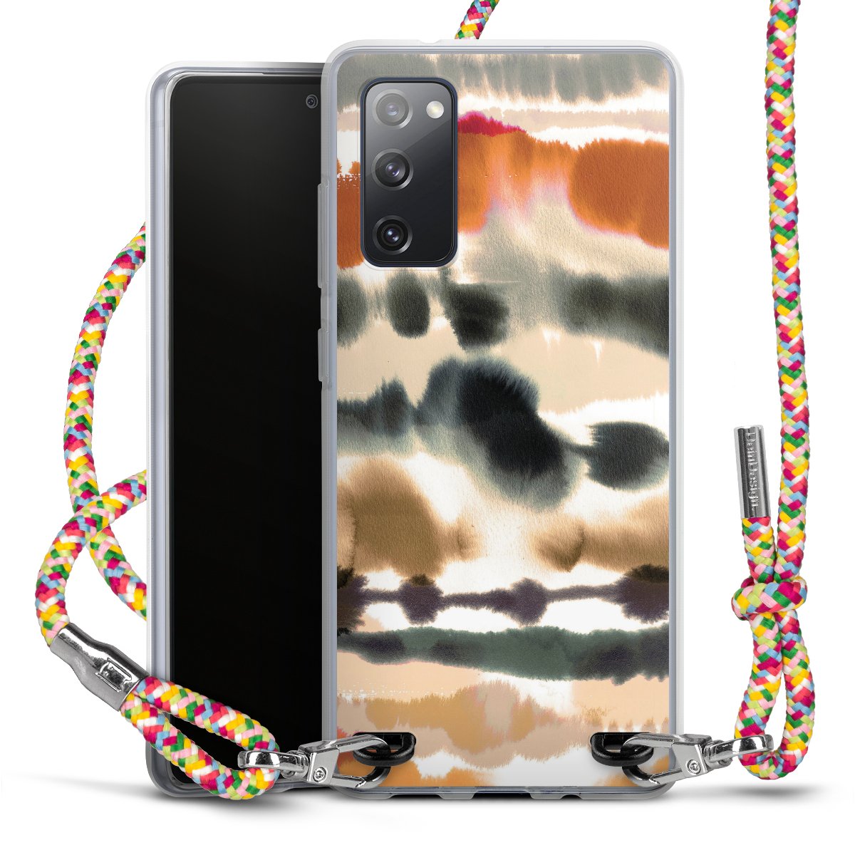The flexible case is made from a highquality TPU material (thermoplastic Polyurethan). Thanks to its longlasting and break resistant characterisitcs, the case is flexible yet consistent in form and has a great grip and feel. The textile strap made from Polyester gives a chic yet casual accent allowing you to carry your phone like a bag or necklace - a practical gadget perfect for your next adventure. The textile strap is about 1.70 meters long and the length can easily be adjusted through the knots. Our Carry Case is available in Colourful, Mint-Camouflage, Very-Berry, Sahara-Sand and Sparkling-Neon. The ends of the textile strap are covered with metallic end caps to protect them against fraying.