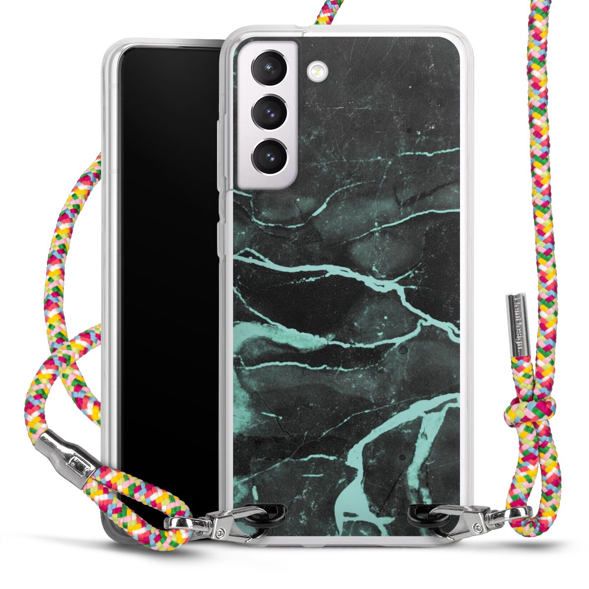 The flexible case is made from a highquality TPU material (thermoplastic Polyurethan). Thanks to its longlasting and break resistant characterisitcs, the case is flexible yet consistent in form and has a great grip and feel. The textile strap made from Polyester gives a chic yet casual accent allowing you to carry your phone like a bag or necklace - a practical gadget perfect for your next adventure. The textile strap is about 1.70 meters long and the length can easily be adjusted through the knots. Our Carry Case is available in Colourful, Mint-Camouflage, Very-Berry, Sahara-Sand and Sparkling-Neon. The ends of the textile strap are covered with metallic end caps to protect them against fraying.