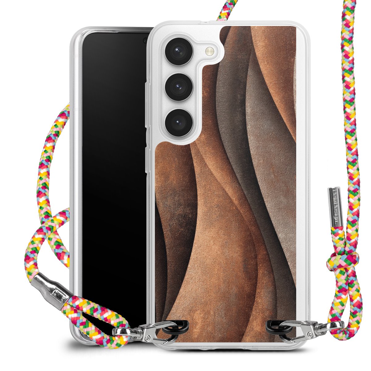 The flexible case is made from a highquality TPU material (thermoplastic Polyurethan). Thanks to its longlasting and break resistant characterisitcs, the case is flexible yet consistent in form and has a great grip and feel. The textile strap made from Polyester gives a chic yet casual accent allowing you to carry your phone like a bag or necklace - a practical gadget perfect for your next adventure. The textile strap is about 1.70 meters long and the length can easily be adjusted through the knots. Our Carry Case is available in Colourful, Mint-Camouflage, Very-Berry, Sahara-Sand and Sparkling-Neon. The ends of the textile strap are covered with metallic end caps to protect them against fraying.