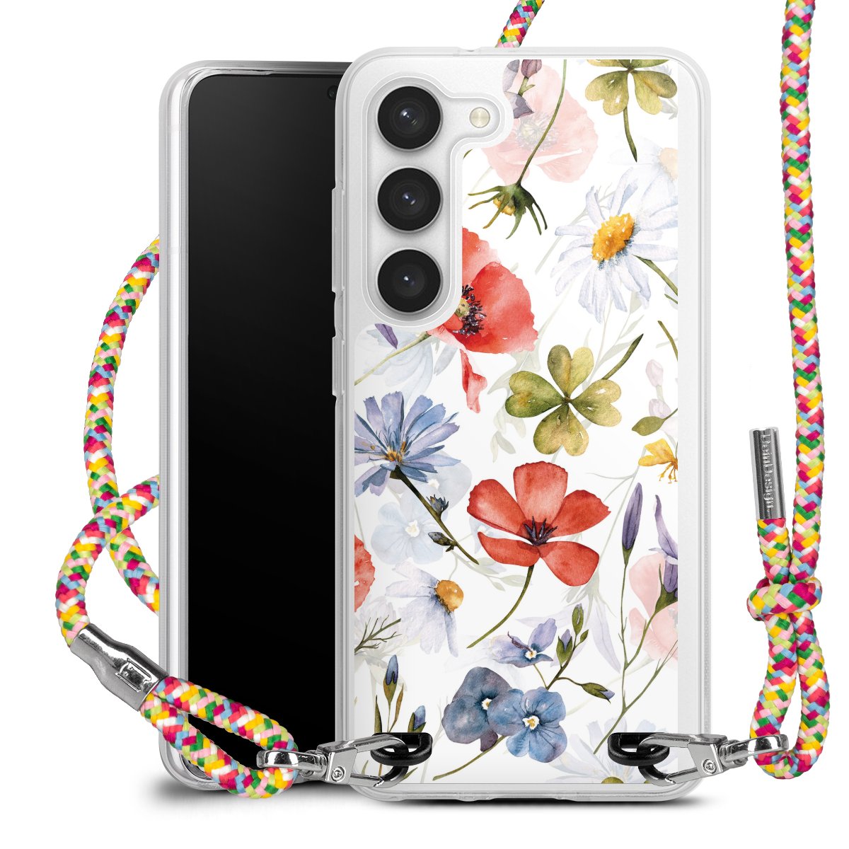 The flexible case is made from a highquality TPU material (thermoplastic Polyurethan). Thanks to its longlasting and break resistant characterisitcs, the case is flexible yet consistent in form and has a great grip and feel. The textile strap made from Polyester gives a chic yet casual accent allowing you to carry your phone like a bag or necklace - a practical gadget perfect for your next adventure. The textile strap is about 1.70 meters long and the length can easily be adjusted through the knots. Our Carry Case is available in Colourful, Mint-Camouflage, Very-Berry, Sahara-Sand and Sparkling-Neon. The ends of the textile strap are covered with metallic end caps to protect them against fraying.