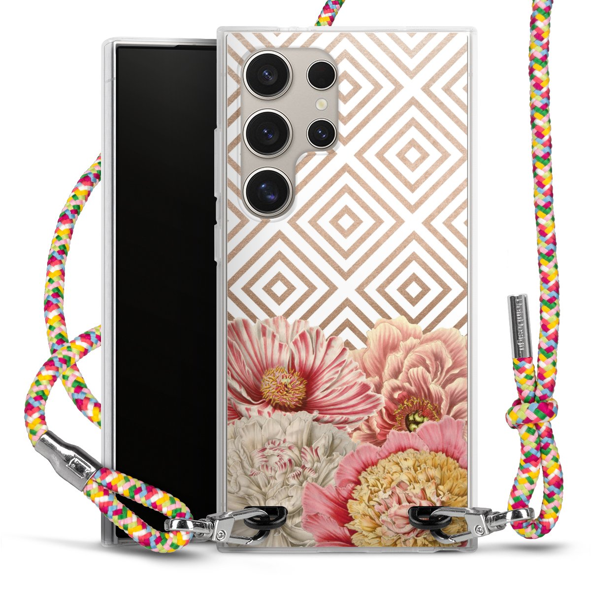 The flexible case is made from a highquality TPU material (thermoplastic Polyurethan). Thanks to its longlasting and break resistant characterisitcs, the case is flexible yet consistent in form and has a great grip and feel. The textile strap made from Polyester gives a chic yet casual accent allowing you to carry your phone like a bag or necklace - a practical gadget perfect for your next adventure. The textile strap is about 1.70 meters long and the length can easily be adjusted through the knots. Our Carry Case is available in Colourful, Mint-Camouflage, Very-Berry, Sahara-Sand and Sparkling-Neon. The ends of the textile strap are covered with metallic end caps to protect them against fraying.