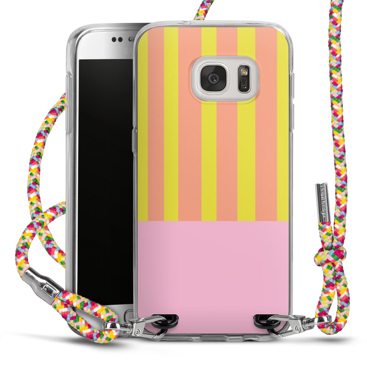 The flexible case is made from a highquality TPU material (thermoplastic Polyurethan). Thanks to its longlasting and break resistant characterisitcs, the case is flexible yet consistent in form and has a great grip and feel. The textile strap made from Polyester gives a chic yet casual accent allowing you to carry your phone like a bag or necklace - a practical gadget perfect for your next adventure. The textile strap is about 1.70 meters long and the length can easily be adjusted through the knots. Our Carry Case is available in Colourful, Mint-Camouflage, Very-Berry, Sahara-Sand and Sparkling-Neon. The ends of the textile strap are covered with metallic end caps to protect them against fraying.