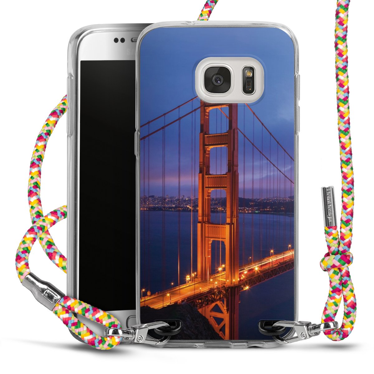 The flexible case is made from a highquality TPU material (thermoplastic Polyurethan). Thanks to its longlasting and break resistant characterisitcs, the case is flexible yet consistent in form and has a great grip and feel. The textile strap made from Polyester gives a chic yet casual accent allowing you to carry your phone like a bag or necklace - a practical gadget perfect for your next adventure. The textile strap is about 1.70 meters long and the length can easily be adjusted through the knots. Our Carry Case is available in Colourful, Mint-Camouflage, Very-Berry, Sahara-Sand and Sparkling-Neon. The ends of the textile strap are covered with metallic end caps to protect them against fraying.