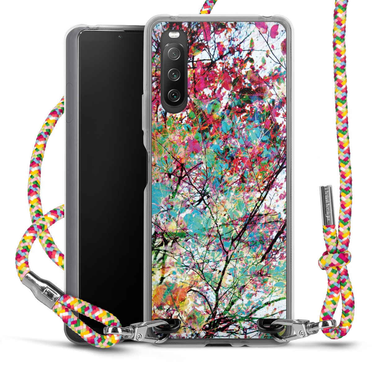 The flexible case is made from a highquality TPU material (thermoplastic Polyurethan). Thanks to its longlasting and break resistant characterisitcs, the case is flexible yet consistent in form and has a great grip and feel. The textile strap made from Polyester gives a chic yet casual accent allowing you to carry your phone like a bag or necklace - a practical gadget perfect for your next adventure. The textile strap is about 1.70 meters long and the length can easily be adjusted through the knots. Our Carry Case is available in Colourful, Mint-Camouflage, Very-Berry, Sahara-Sand and Sparkling-Neon. The ends of the textile strap are covered with metallic end caps to protect them against fraying.
