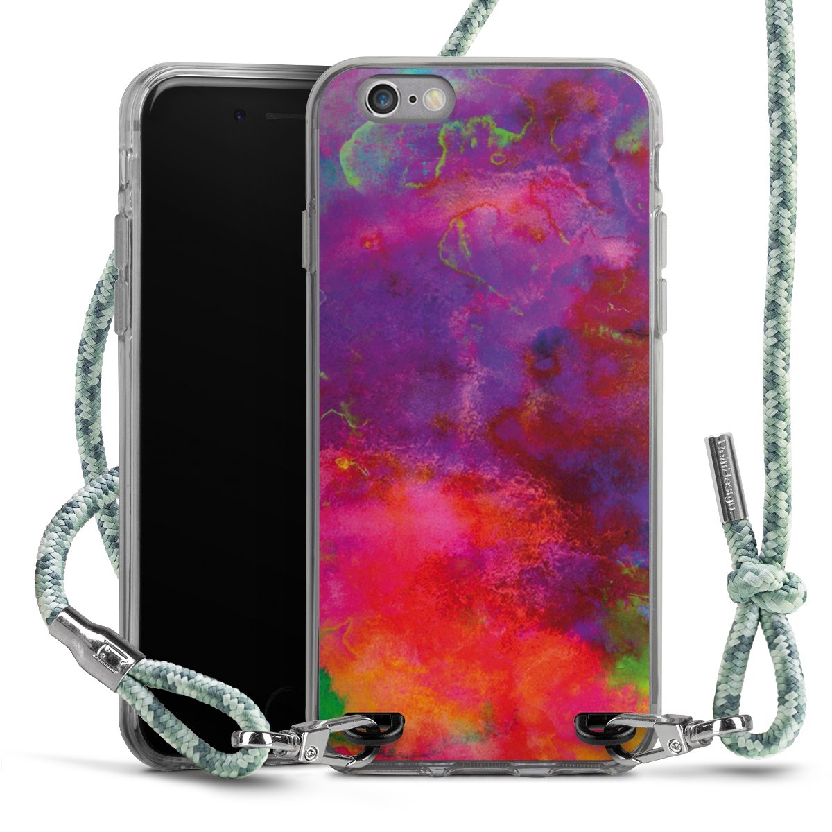 The flexible case is made from a highquality TPU material (thermoplastic Polyurethan). Thanks to its longlasting and break resistant characterisitcs, the case is flexible yet consistent in form and has a great grip and feel. The textile strap made from Polyester gives a chic yet casual accent allowing you to carry your phone like a bag or necklace - a practical gadget perfect for your next adventure. The textile strap is about 1.70 meters long and the length can easily be adjusted through the knots. Our Carry Case is available in Colourful, Mint-Camouflage, Very-Berry, Sahara-Sand and Sparkling-Neon. The ends of the textile strap are covered with metallic end caps to protect them against fraying.