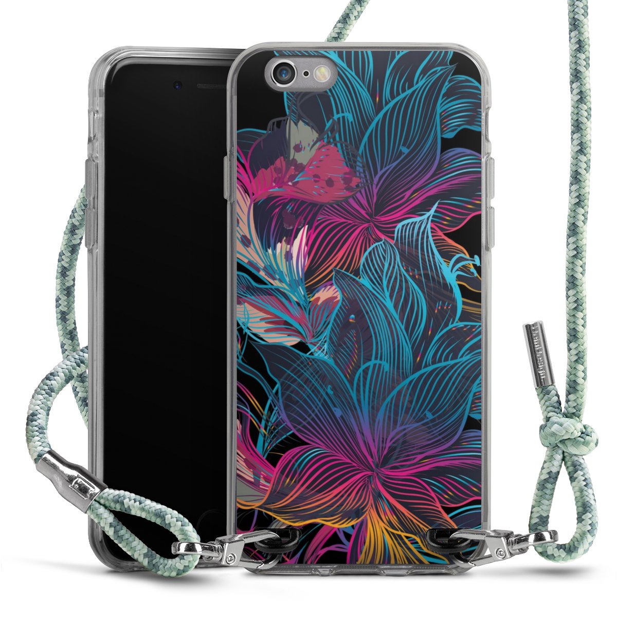 The flexible case is made from a highquality TPU material (thermoplastic Polyurethan). Thanks to its longlasting and break resistant characterisitcs, the case is flexible yet consistent in form and has a great grip and feel. The textile strap made from Polyester gives a chic yet casual accent allowing you to carry your phone like a bag or necklace - a practical gadget perfect for your next adventure. The textile strap is about 1.70 meters long and the length can easily be adjusted through the knots. Our Carry Case is available in Colourful, Mint-Camouflage, Very-Berry, Sahara-Sand and Sparkling-Neon. The ends of the textile strap are covered with metallic end caps to protect them against fraying.
