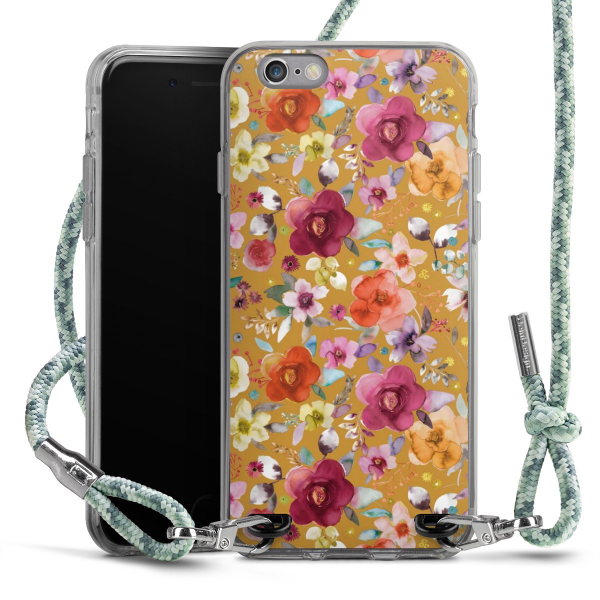 The flexible case is made from a highquality TPU material (thermoplastic Polyurethan). Thanks to its longlasting and break resistant characterisitcs, the case is flexible yet consistent in form and has a great grip and feel. The textile strap made from Polyester gives a chic yet casual accent allowing you to carry your phone like a bag or necklace - a practical gadget perfect for your next adventure. The textile strap is about 1.70 meters long and the length can easily be adjusted through the knots. Our Carry Case is available in Colourful, Mint-Camouflage, Very-Berry, Sahara-Sand and Sparkling-Neon. The ends of the textile strap are covered with metallic end caps to protect them against fraying.