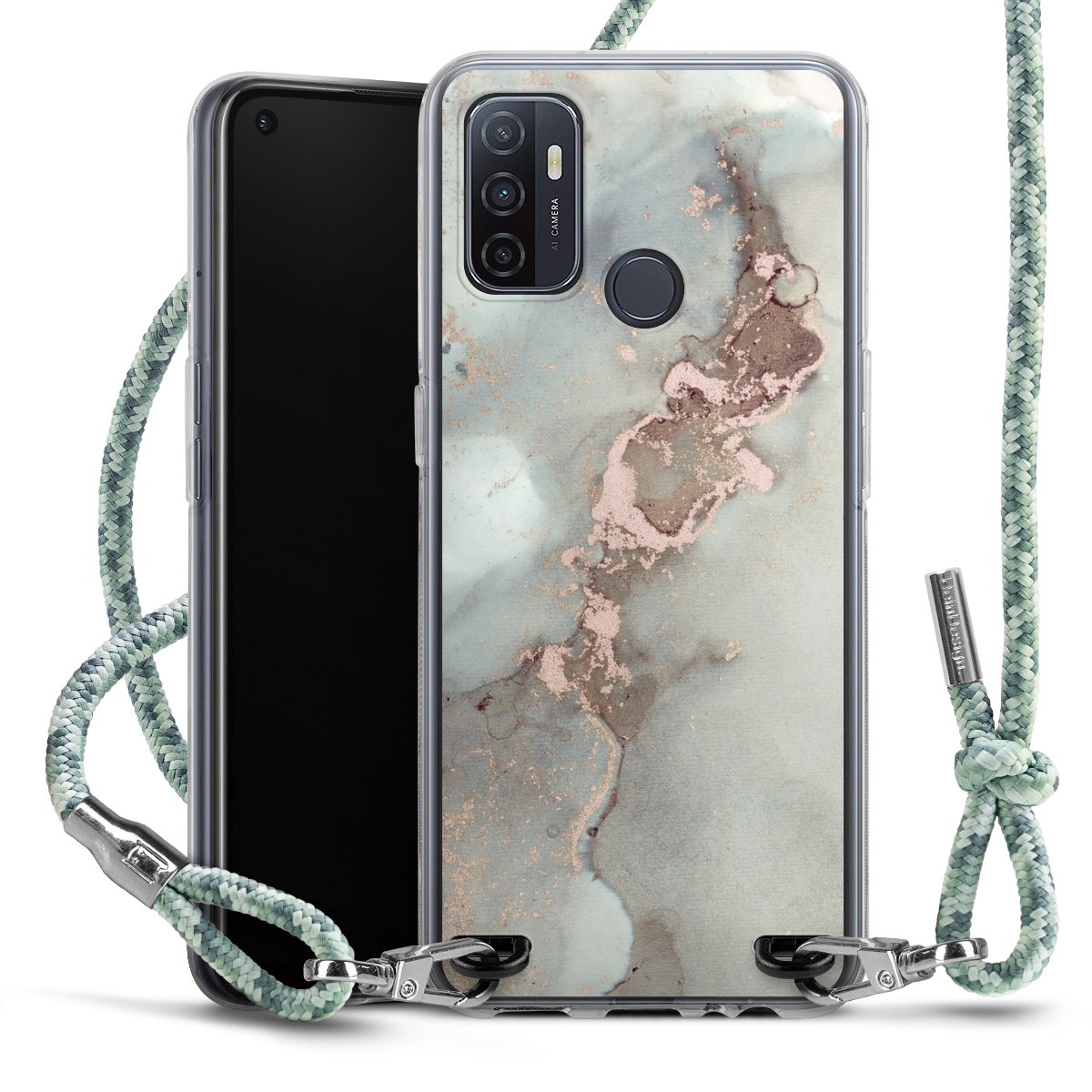The flexible case is made from a highquality TPU material (thermoplastic Polyurethan). Thanks to its longlasting and break resistant characterisitcs, the case is flexible yet consistent in form and has a great grip and feel. The textile strap made from Polyester gives a chic yet casual accent allowing you to carry your phone like a bag or necklace - a practical gadget perfect for your next adventure. The textile strap is about 1.70 meters long and the length can easily be adjusted through the knots. Our Carry Case is available in Colourful, Mint-Camouflage, Very-Berry, Sahara-Sand and Sparkling-Neon. The ends of the textile strap are covered with metallic end caps to protect them against fraying.