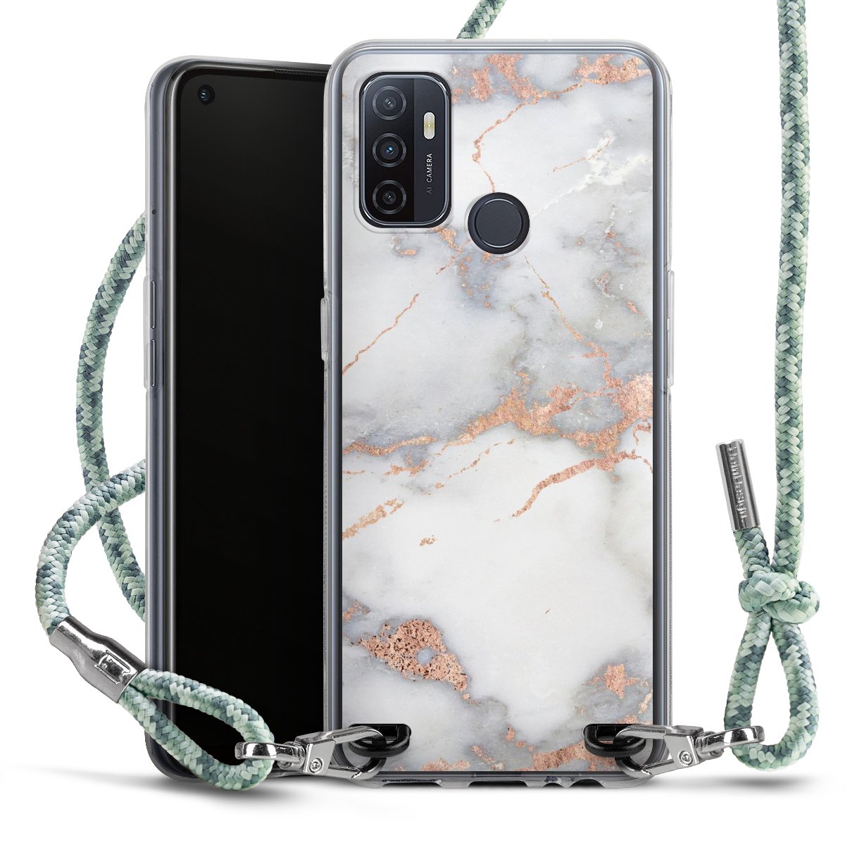 The flexible case is made from a highquality TPU material (thermoplastic Polyurethan). Thanks to its longlasting and break resistant characterisitcs, the case is flexible yet consistent in form and has a great grip and feel. The textile strap made from Polyester gives a chic yet casual accent allowing you to carry your phone like a bag or necklace - a practical gadget perfect for your next adventure. The textile strap is about 1.70 meters long and the length can easily be adjusted through the knots. Our Carry Case is available in Colourful, Mint-Camouflage, Very-Berry, Sahara-Sand and Sparkling-Neon. The ends of the textile strap are covered with metallic end caps to protect them against fraying.