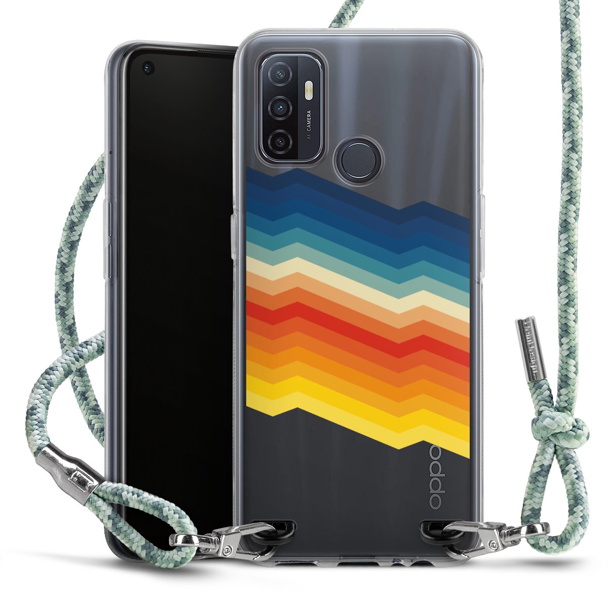 The flexible case is made from a highquality TPU material (thermoplastic Polyurethan). Thanks to its longlasting and break resistant characterisitcs, the case is flexible yet consistent in form and has a great grip and feel. The textile strap made from Polyester gives a chic yet casual accent allowing you to carry your phone like a bag or necklace - a practical gadget perfect for your next adventure. The textile strap is about 1.70 meters long and the length can easily be adjusted through the knots. Our Carry Case is available in Colourful, Mint-Camouflage, Very-Berry, Sahara-Sand and Sparkling-Neon. The ends of the textile strap are covered with metallic end caps to protect them against fraying.