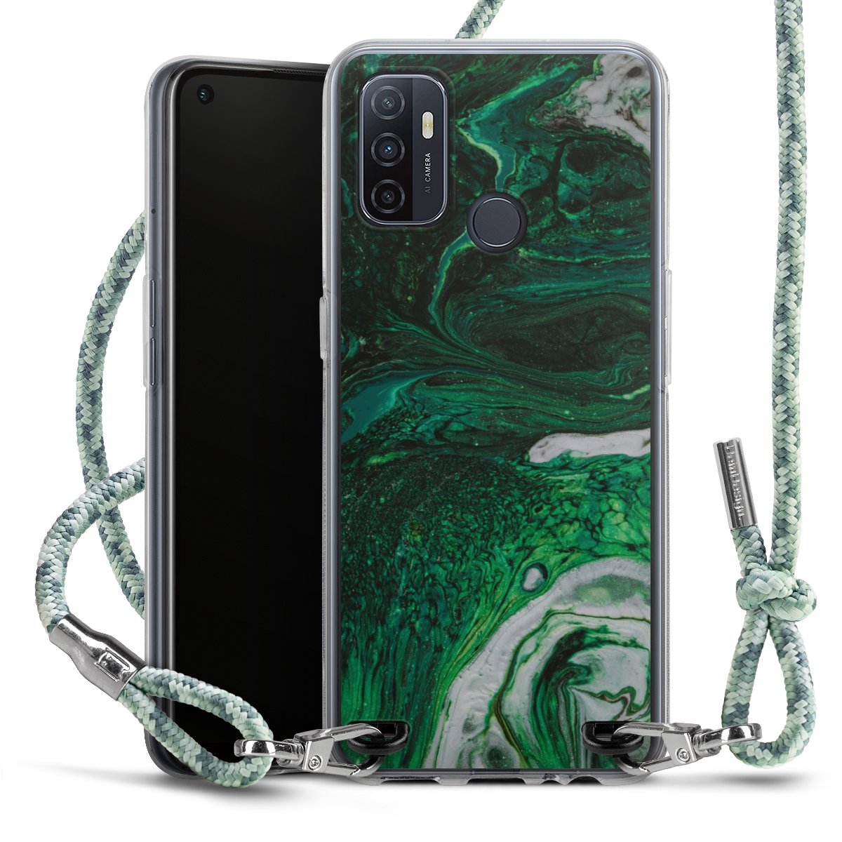 The flexible case is made from a highquality TPU material (thermoplastic Polyurethan). Thanks to its longlasting and break resistant characterisitcs, the case is flexible yet consistent in form and has a great grip and feel. The textile strap made from Polyester gives a chic yet casual accent allowing you to carry your phone like a bag or necklace - a practical gadget perfect for your next adventure. The textile strap is about 1.70 meters long and the length can easily be adjusted through the knots. Our Carry Case is available in Colourful, Mint-Camouflage, Very-Berry, Sahara-Sand and Sparkling-Neon. The ends of the textile strap are covered with metallic end caps to protect them against fraying.