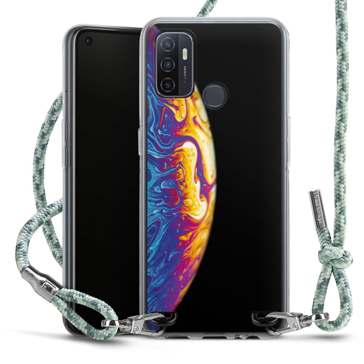 The flexible case is made from a highquality TPU material (thermoplastic Polyurethan). Thanks to its longlasting and break resistant characterisitcs, the case is flexible yet consistent in form and has a great grip and feel. The textile strap made from Polyester gives a chic yet casual accent allowing you to carry your phone like a bag or necklace - a practical gadget perfect for your next adventure. The textile strap is about 1.70 meters long and the length can easily be adjusted through the knots. Our Carry Case is available in Colourful, Mint-Camouflage, Very-Berry, Sahara-Sand and Sparkling-Neon. The ends of the textile strap are covered with metallic end caps to protect them against fraying.