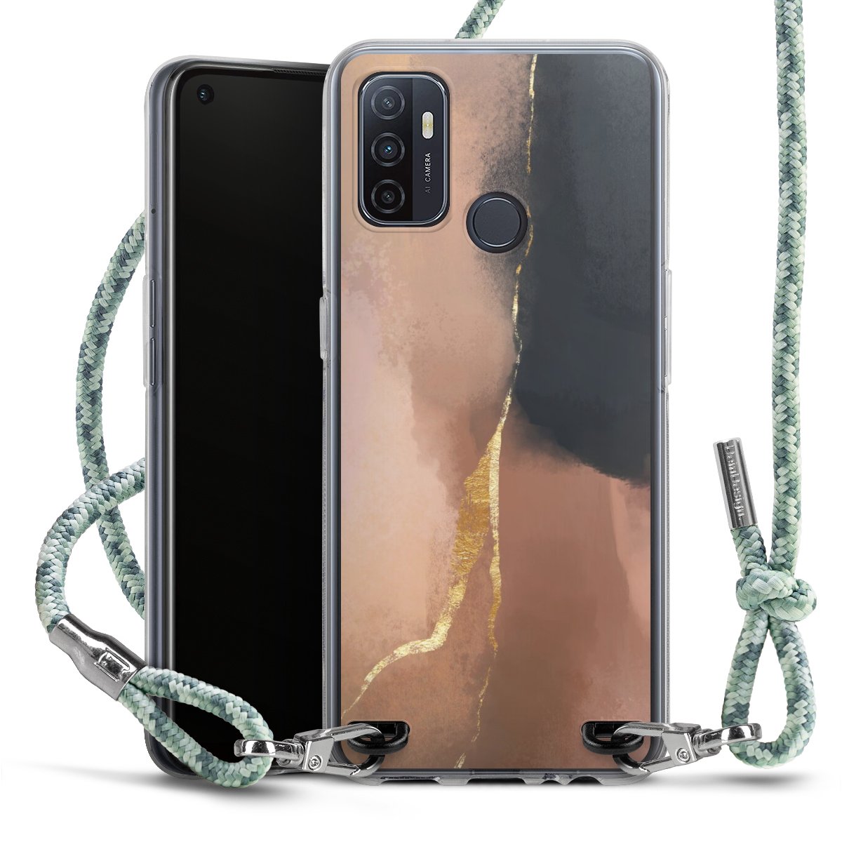 The flexible case is made from a highquality TPU material (thermoplastic Polyurethan). Thanks to its longlasting and break resistant characterisitcs, the case is flexible yet consistent in form and has a great grip and feel. The textile strap made from Polyester gives a chic yet casual accent allowing you to carry your phone like a bag or necklace - a practical gadget perfect for your next adventure. The textile strap is about 1.70 meters long and the length can easily be adjusted through the knots. Our Carry Case is available in Colourful, Mint-Camouflage, Very-Berry, Sahara-Sand and Sparkling-Neon. The ends of the textile strap are covered with metallic end caps to protect them against fraying.