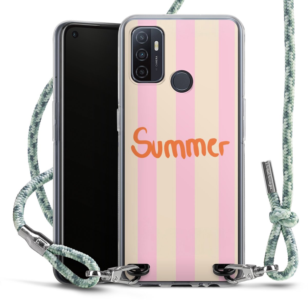 The flexible case is made from a highquality TPU material (thermoplastic Polyurethan). Thanks to its longlasting and break resistant characterisitcs, the case is flexible yet consistent in form and has a great grip and feel. The textile strap made from Polyester gives a chic yet casual accent allowing you to carry your phone like a bag or necklace - a practical gadget perfect for your next adventure. The textile strap is about 1.70 meters long and the length can easily be adjusted through the knots. Our Carry Case is available in Colourful, Mint-Camouflage, Very-Berry, Sahara-Sand and Sparkling-Neon. The ends of the textile strap are covered with metallic end caps to protect them against fraying.