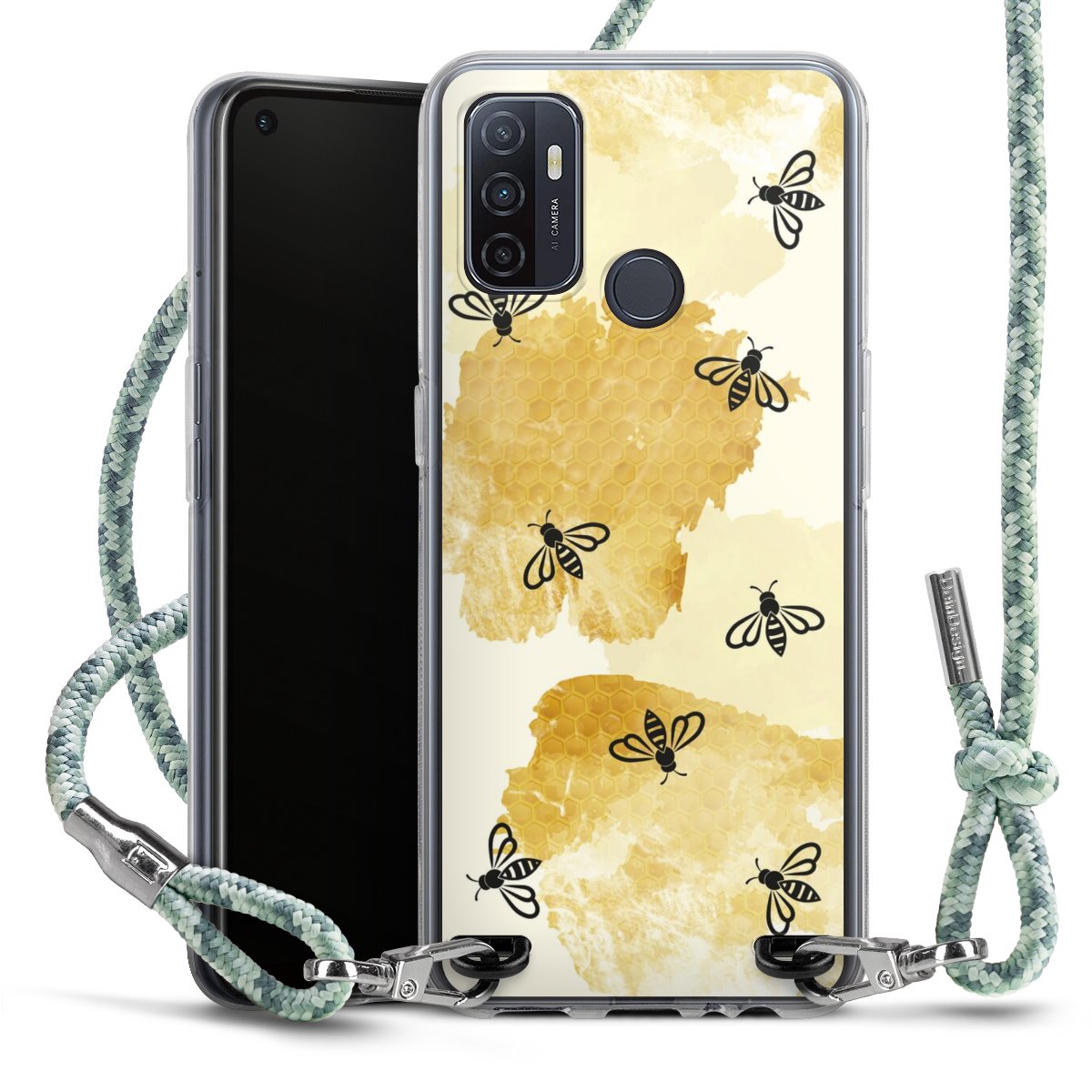 The flexible case is made from a highquality TPU material (thermoplastic Polyurethan). Thanks to its longlasting and break resistant characterisitcs, the case is flexible yet consistent in form and has a great grip and feel. The textile strap made from Polyester gives a chic yet casual accent allowing you to carry your phone like a bag or necklace - a practical gadget perfect for your next adventure. The textile strap is about 1.70 meters long and the length can easily be adjusted through the knots. Our Carry Case is available in Colourful, Mint-Camouflage, Very-Berry, Sahara-Sand and Sparkling-Neon. The ends of the textile strap are covered with metallic end caps to protect them against fraying.
