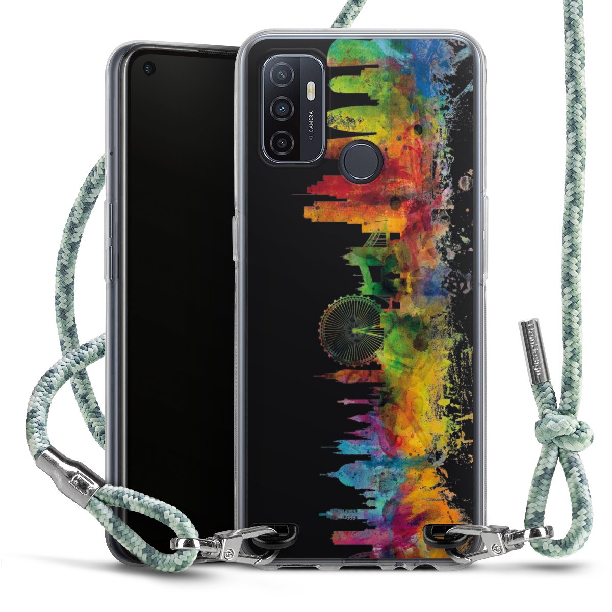The flexible case is made from a highquality TPU material (thermoplastic Polyurethan). Thanks to its longlasting and break resistant characterisitcs, the case is flexible yet consistent in form and has a great grip and feel. The textile strap made from Polyester gives a chic yet casual accent allowing you to carry your phone like a bag or necklace - a practical gadget perfect for your next adventure. The textile strap is about 1.70 meters long and the length can easily be adjusted through the knots. Our Carry Case is available in Colourful, Mint-Camouflage, Very-Berry, Sahara-Sand and Sparkling-Neon. The ends of the textile strap are covered with metallic end caps to protect them against fraying.