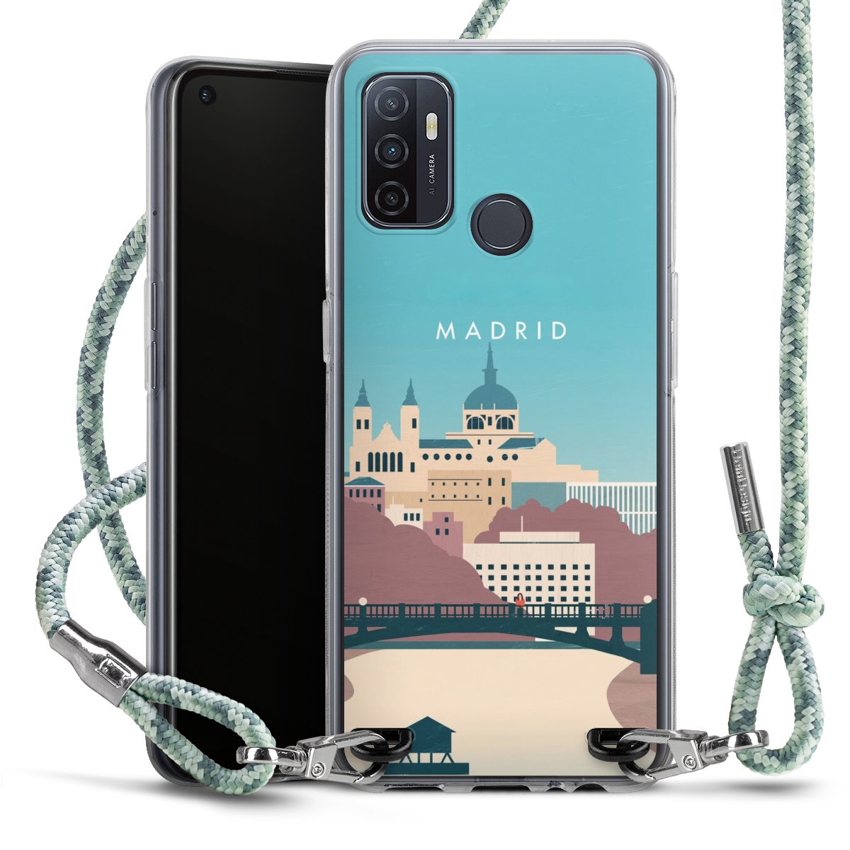 The flexible case is made from a highquality TPU material (thermoplastic Polyurethan). Thanks to its longlasting and break resistant characterisitcs, the case is flexible yet consistent in form and has a great grip and feel. The textile strap made from Polyester gives a chic yet casual accent allowing you to carry your phone like a bag or necklace - a practical gadget perfect for your next adventure. The textile strap is about 1.70 meters long and the length can easily be adjusted through the knots. Our Carry Case is available in Colourful, Mint-Camouflage, Very-Berry, Sahara-Sand and Sparkling-Neon. The ends of the textile strap are covered with metallic end caps to protect them against fraying.