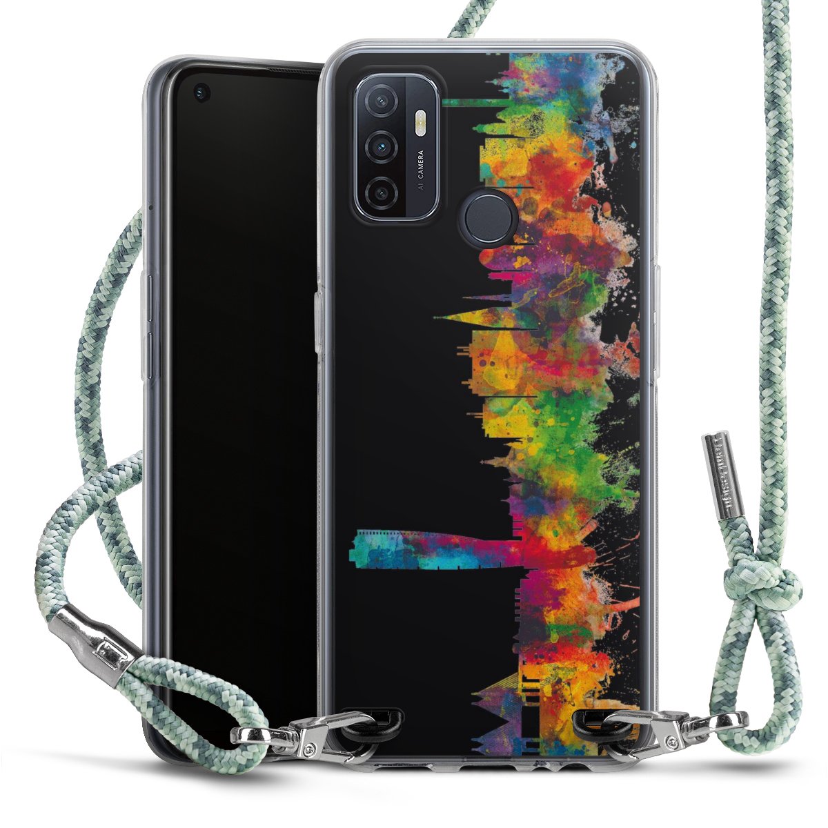The flexible case is made from a highquality TPU material (thermoplastic Polyurethan). Thanks to its longlasting and break resistant characterisitcs, the case is flexible yet consistent in form and has a great grip and feel. The textile strap made from Polyester gives a chic yet casual accent allowing you to carry your phone like a bag or necklace - a practical gadget perfect for your next adventure. The textile strap is about 1.70 meters long and the length can easily be adjusted through the knots. Our Carry Case is available in Colourful, Mint-Camouflage, Very-Berry, Sahara-Sand and Sparkling-Neon. The ends of the textile strap are covered with metallic end caps to protect them against fraying.