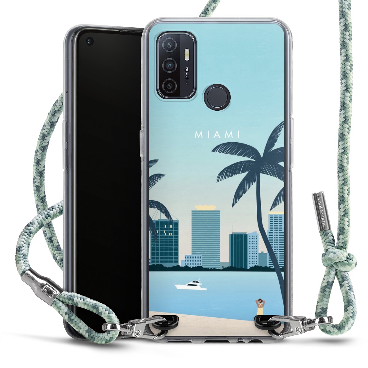 The flexible case is made from a highquality TPU material (thermoplastic Polyurethan). Thanks to its longlasting and break resistant characterisitcs, the case is flexible yet consistent in form and has a great grip and feel. The textile strap made from Polyester gives a chic yet casual accent allowing you to carry your phone like a bag or necklace - a practical gadget perfect for your next adventure. The textile strap is about 1.70 meters long and the length can easily be adjusted through the knots. Our Carry Case is available in Colourful, Mint-Camouflage, Very-Berry, Sahara-Sand and Sparkling-Neon. The ends of the textile strap are covered with metallic end caps to protect them against fraying.