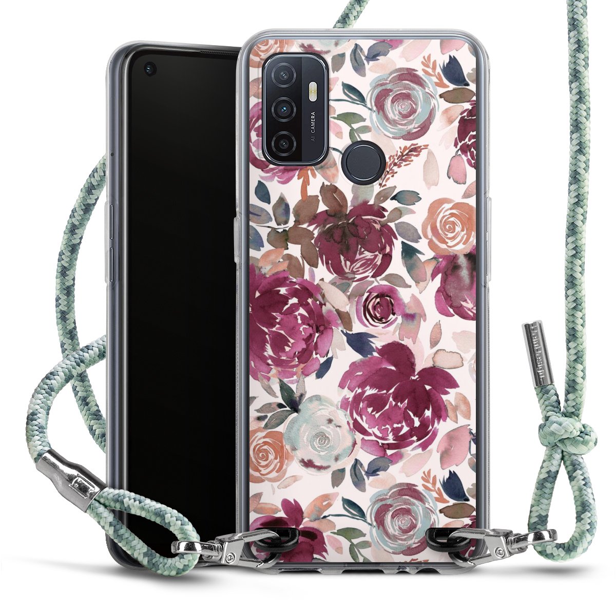 The flexible case is made from a highquality TPU material (thermoplastic Polyurethan). Thanks to its longlasting and break resistant characterisitcs, the case is flexible yet consistent in form and has a great grip and feel. The textile strap made from Polyester gives a chic yet casual accent allowing you to carry your phone like a bag or necklace - a practical gadget perfect for your next adventure. The textile strap is about 1.70 meters long and the length can easily be adjusted through the knots. Our Carry Case is available in Colourful, Mint-Camouflage, Very-Berry, Sahara-Sand and Sparkling-Neon. The ends of the textile strap are covered with metallic end caps to protect them against fraying.