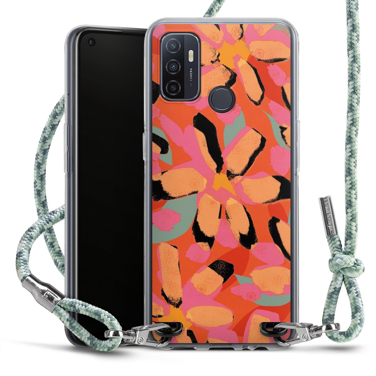 The flexible case is made from a highquality TPU material (thermoplastic Polyurethan). Thanks to its longlasting and break resistant characterisitcs, the case is flexible yet consistent in form and has a great grip and feel. The textile strap made from Polyester gives a chic yet casual accent allowing you to carry your phone like a bag or necklace - a practical gadget perfect for your next adventure. The textile strap is about 1.70 meters long and the length can easily be adjusted through the knots. Our Carry Case is available in Colourful, Mint-Camouflage, Very-Berry, Sahara-Sand and Sparkling-Neon. The ends of the textile strap are covered with metallic end caps to protect them against fraying.