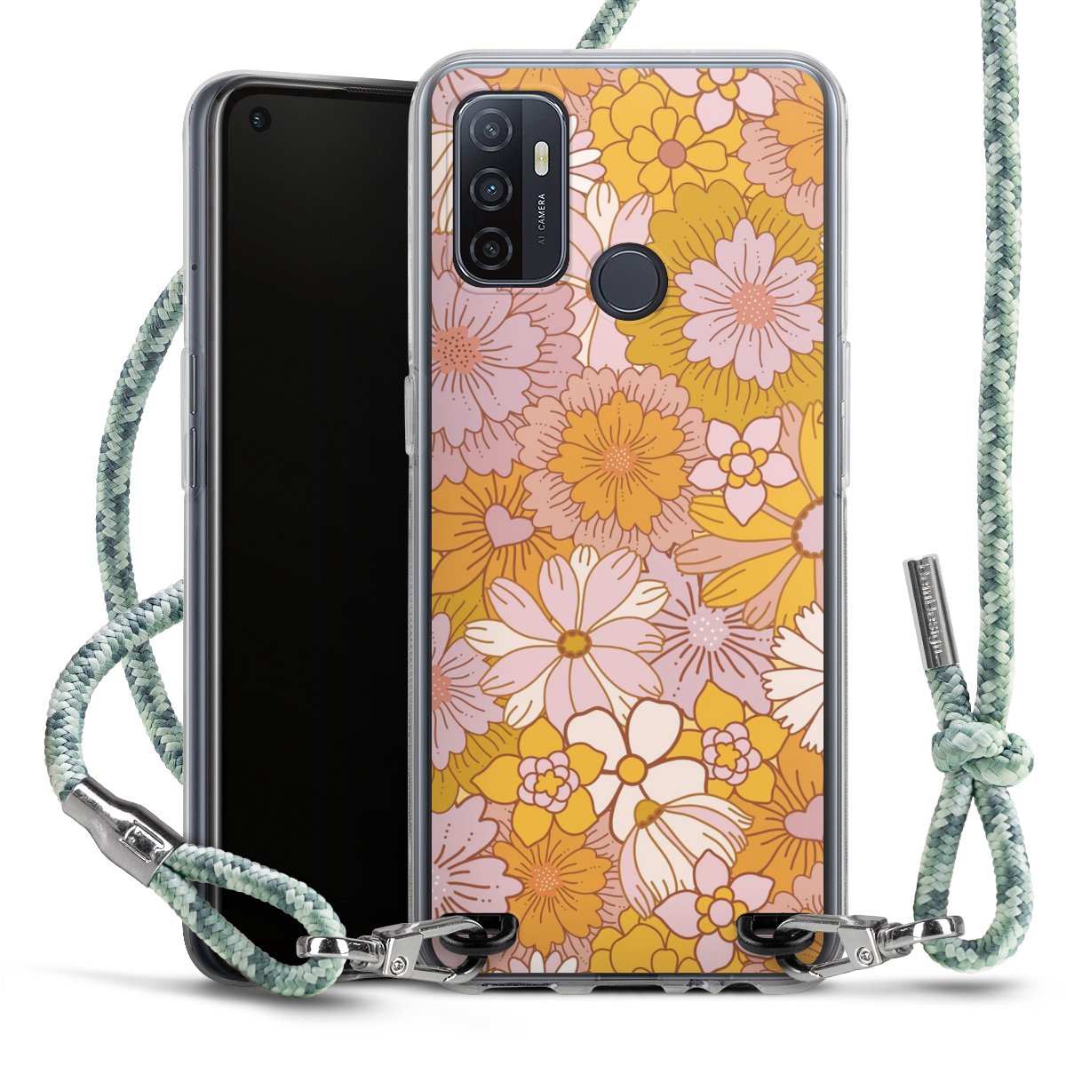 The flexible case is made from a highquality TPU material (thermoplastic Polyurethan). Thanks to its longlasting and break resistant characterisitcs, the case is flexible yet consistent in form and has a great grip and feel. The textile strap made from Polyester gives a chic yet casual accent allowing you to carry your phone like a bag or necklace - a practical gadget perfect for your next adventure. The textile strap is about 1.70 meters long and the length can easily be adjusted through the knots. Our Carry Case is available in Colourful, Mint-Camouflage, Very-Berry, Sahara-Sand and Sparkling-Neon. The ends of the textile strap are covered with metallic end caps to protect them against fraying.