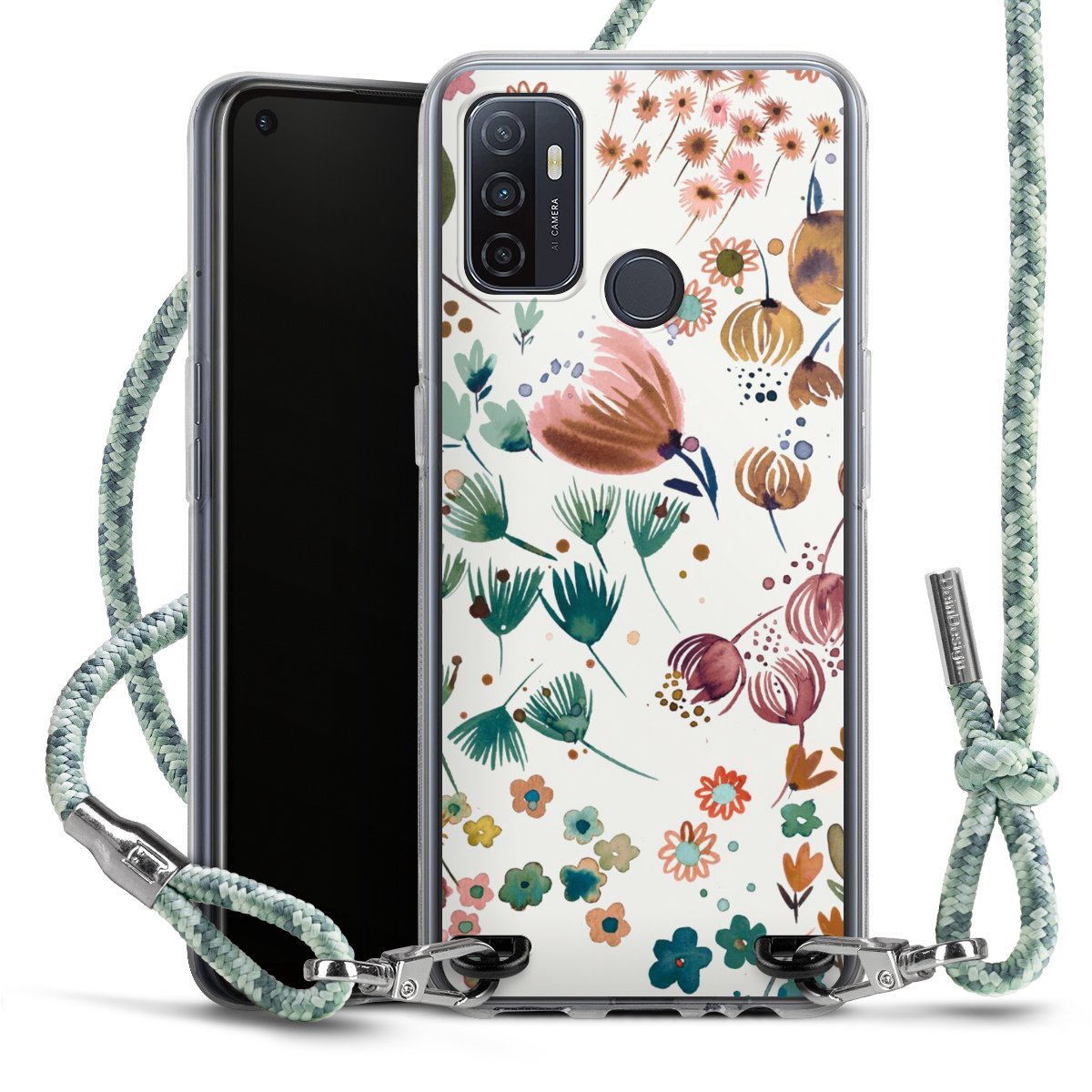The flexible case is made from a highquality TPU material (thermoplastic Polyurethan). Thanks to its longlasting and break resistant characterisitcs, the case is flexible yet consistent in form and has a great grip and feel. The textile strap made from Polyester gives a chic yet casual accent allowing you to carry your phone like a bag or necklace - a practical gadget perfect for your next adventure. The textile strap is about 1.70 meters long and the length can easily be adjusted through the knots. Our Carry Case is available in Colourful, Mint-Camouflage, Very-Berry, Sahara-Sand and Sparkling-Neon. The ends of the textile strap are covered with metallic end caps to protect them against fraying.