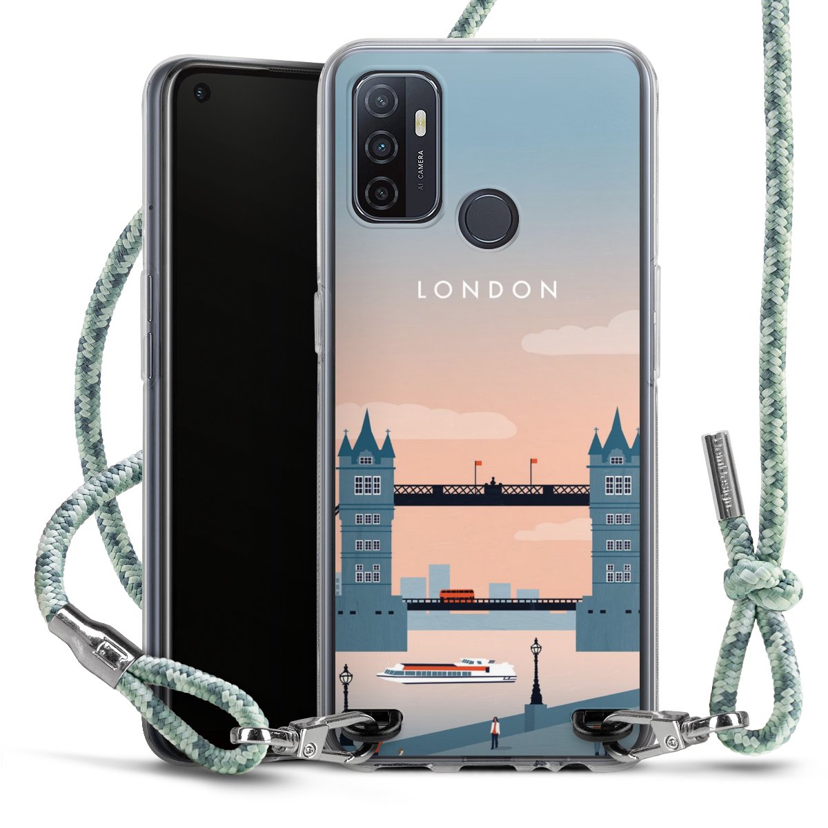 The flexible case is made from a highquality TPU material (thermoplastic Polyurethan). Thanks to its longlasting and break resistant characterisitcs, the case is flexible yet consistent in form and has a great grip and feel. The textile strap made from Polyester gives a chic yet casual accent allowing you to carry your phone like a bag or necklace - a practical gadget perfect for your next adventure. The textile strap is about 1.70 meters long and the length can easily be adjusted through the knots. Our Carry Case is available in Colourful, Mint-Camouflage, Very-Berry, Sahara-Sand and Sparkling-Neon. The ends of the textile strap are covered with metallic end caps to protect them against fraying.