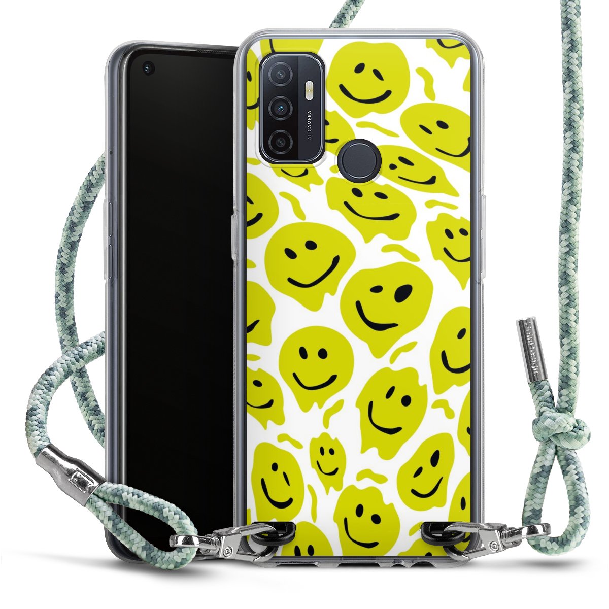 The flexible case is made from a highquality TPU material (thermoplastic Polyurethan). Thanks to its longlasting and break resistant characterisitcs, the case is flexible yet consistent in form and has a great grip and feel. The textile strap made from Polyester gives a chic yet casual accent allowing you to carry your phone like a bag or necklace - a practical gadget perfect for your next adventure. The textile strap is about 1.70 meters long and the length can easily be adjusted through the knots. Our Carry Case is available in Colourful, Mint-Camouflage, Very-Berry, Sahara-Sand and Sparkling-Neon. The ends of the textile strap are covered with metallic end caps to protect them against fraying.